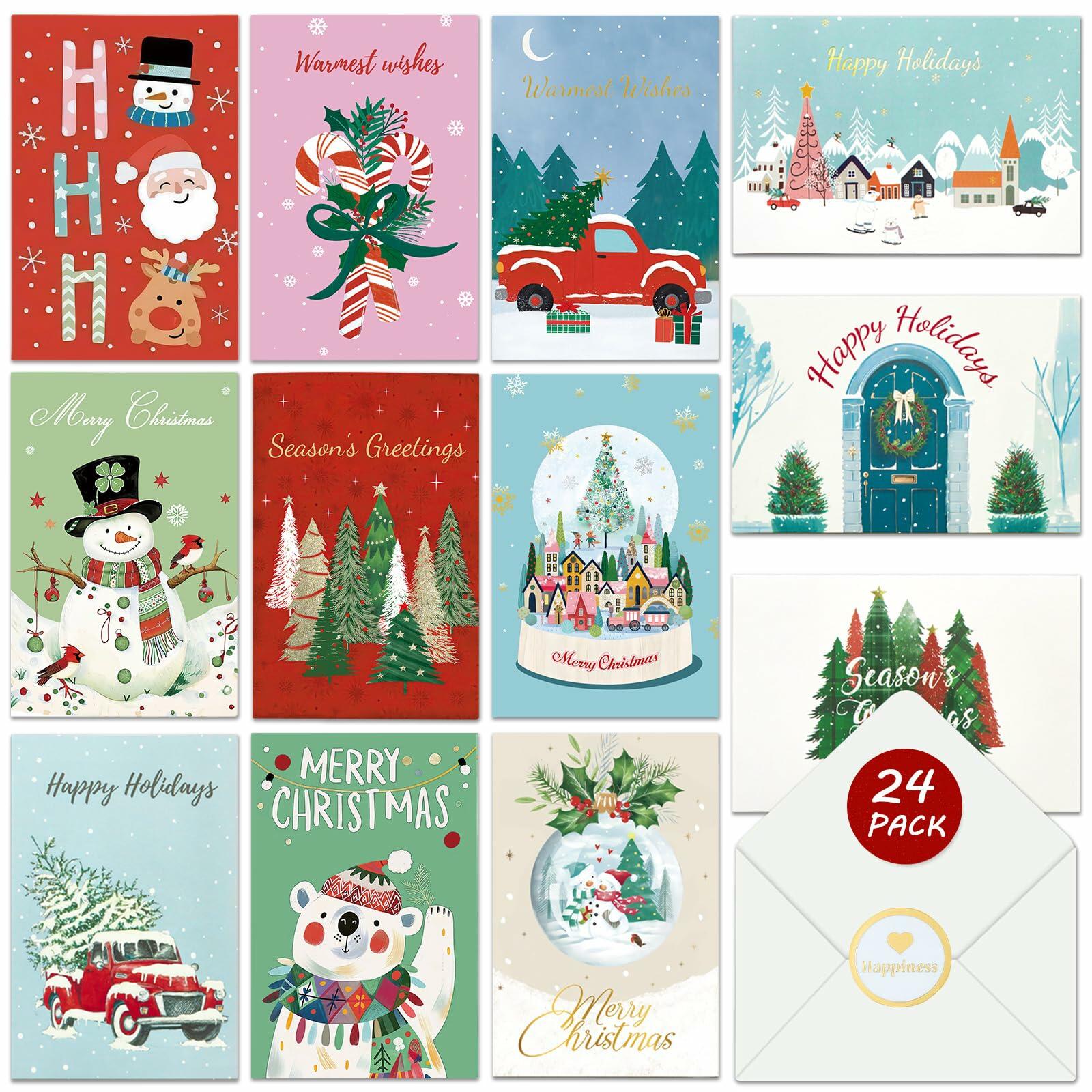 - BOXED CHRISTMAS CARDS WITH ENVELOPES: Delight your friends and family with our 24-pack of 4" x 6" boxed Christmas cards, featuring 12 unique designs that capture the magic of the holiday season. Each set includes 24 high-quality envelopes (12 white and 12 red) and 24 festive stickers, ensuring your holiday greetings stand out with a personal touch.