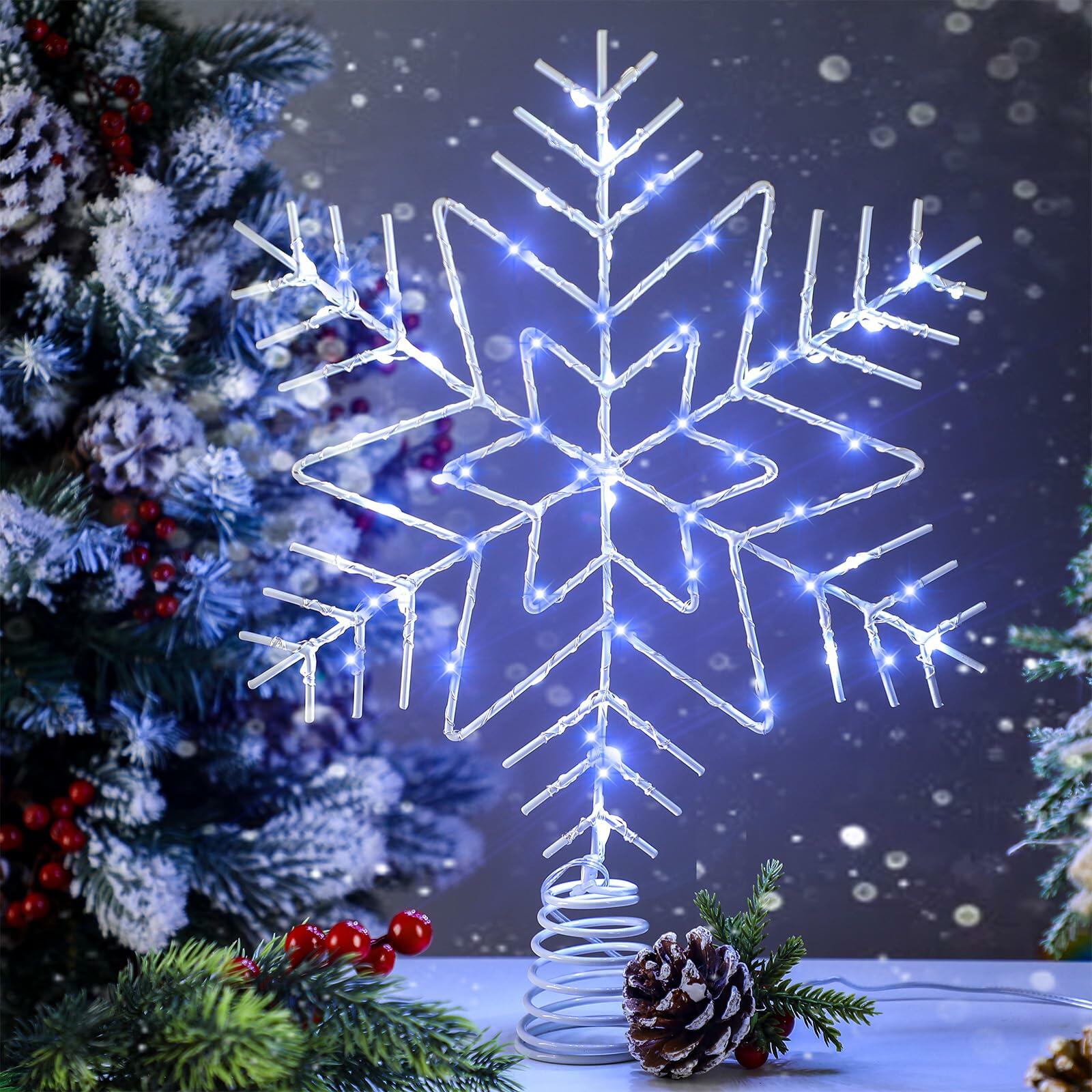 - Warm and Glowing Christmas Tree Topper: our tree topper embedded with 70 bright white lights gifts your Christmas tree a radiant aura; The grand snowflake design will add a colorful warmth to your Christmas atmosphere and light-up your entire evening