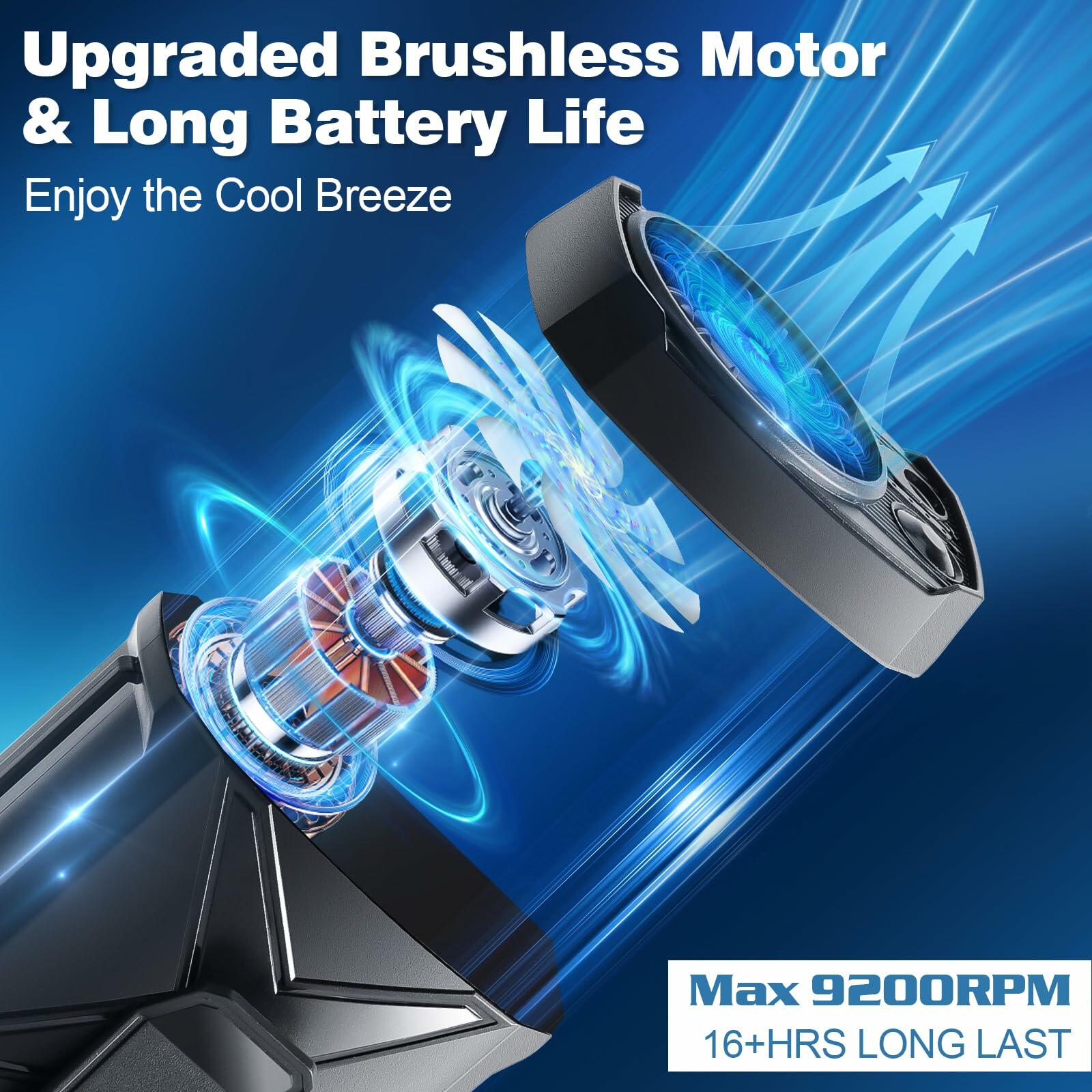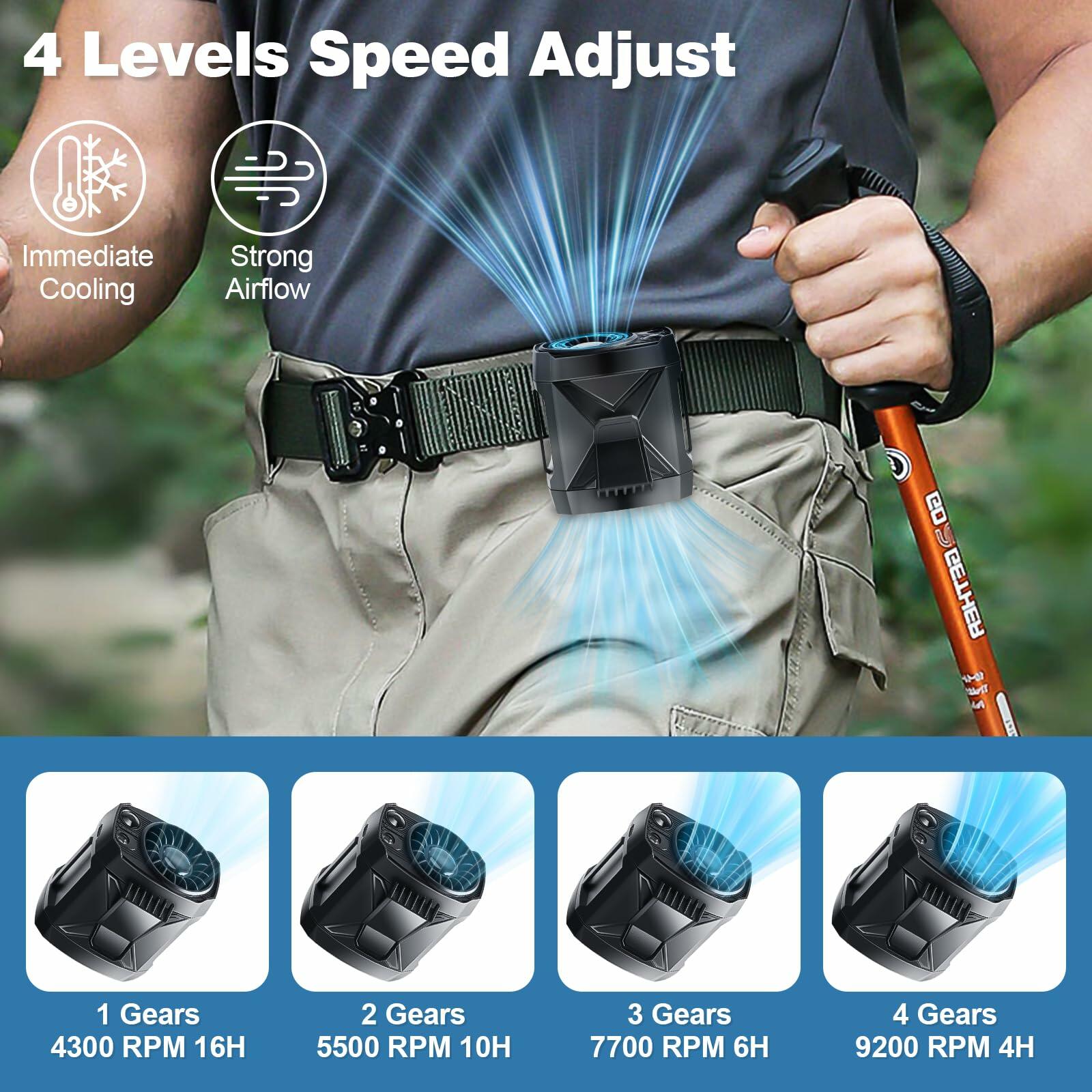 - Upgrade Powerful Waist Fan: The 2025 waist clip fan has been comprehensively upgraded with 4-speed adjustable airflow. Equipped with a newly upgraded high-speed brushless motor and a 5-blade turbofan that max rotation spins up to 9200RPM and provides airflow speeds up to 20ft/s, providing stronger and more concentrated airflow
