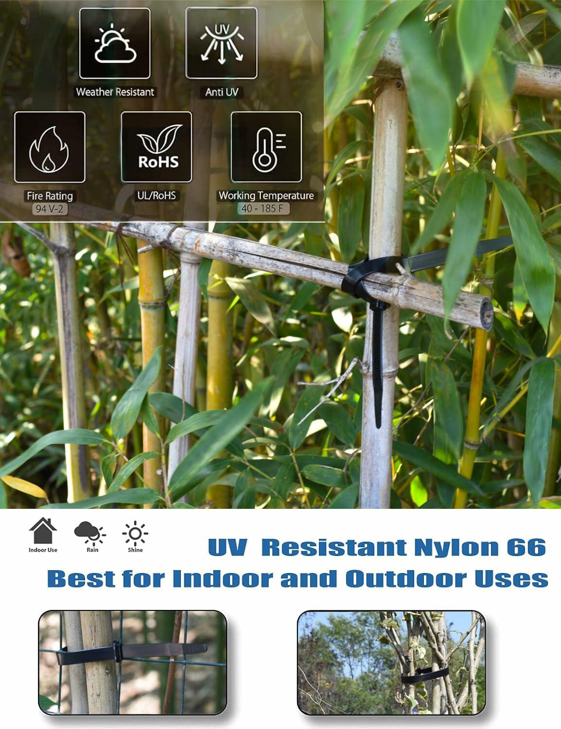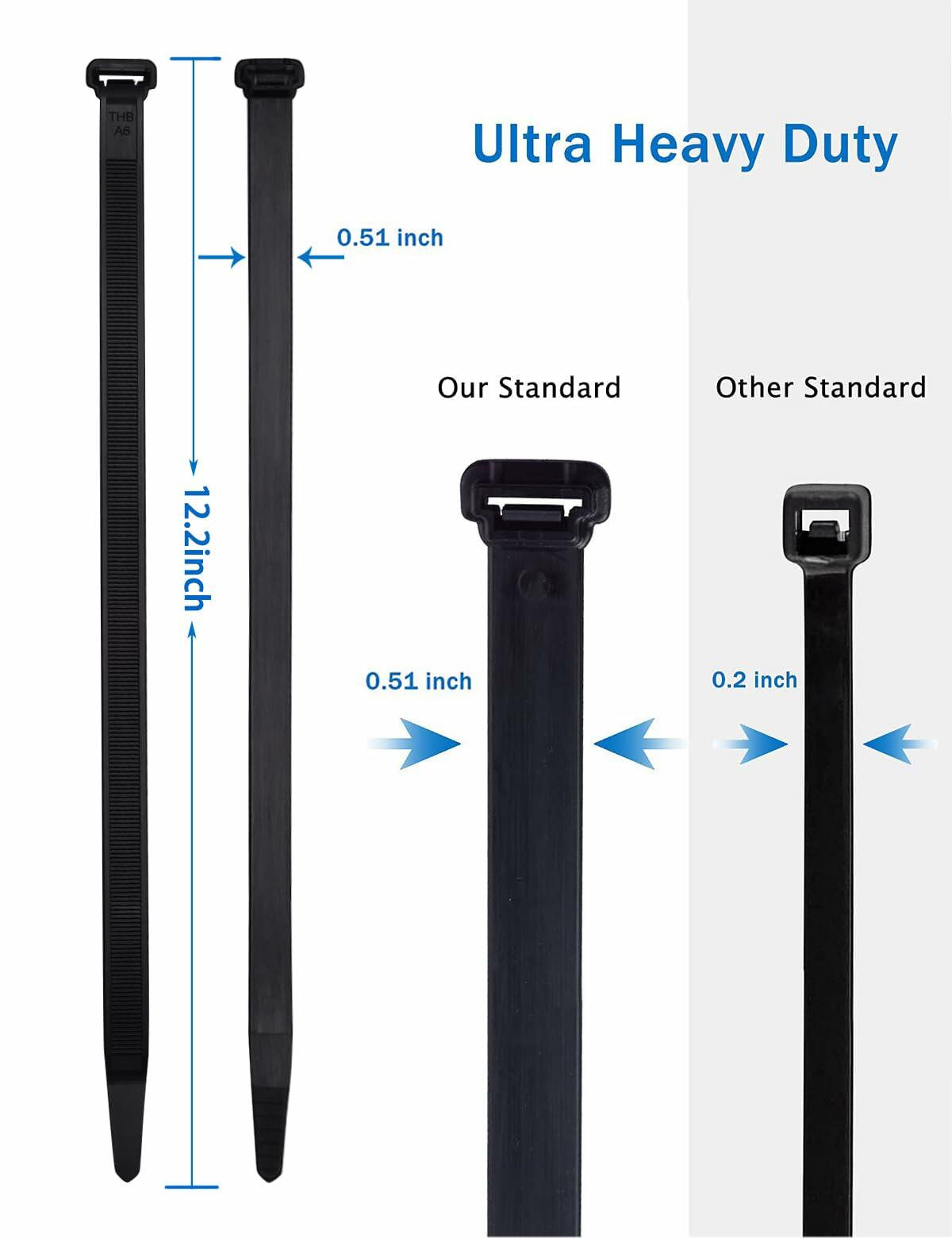 - 【 Strong and heavy duty 】Ultra heavy duty cable tie with 250 lbs. W:0.51 inch T: 0.068 inch, Wider and thicker than others, made with industrial strength 6/6 Nylon and UV resistant. High-quality material, thickened and widened design make the cable tie stronger and more durable. Reasonable length makes it more practical both indoors and outdoors.