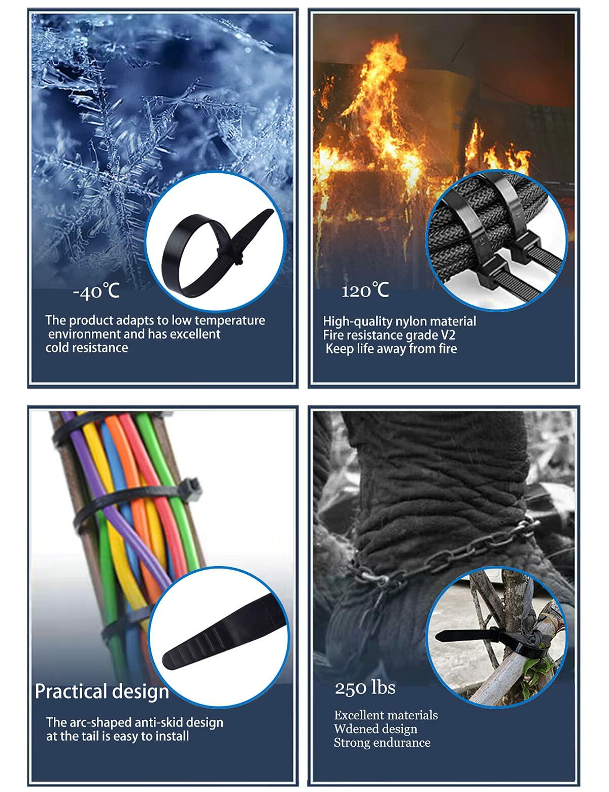 - 【 Wide range of uses 】 Working Temperature -40 to 120 degrees C or -40 to 248 degrees F. Cable ties are great organizers for bundles of wire and fixing other items, suitable for home, garage, office, garden, travel, workshop, machinery, car.