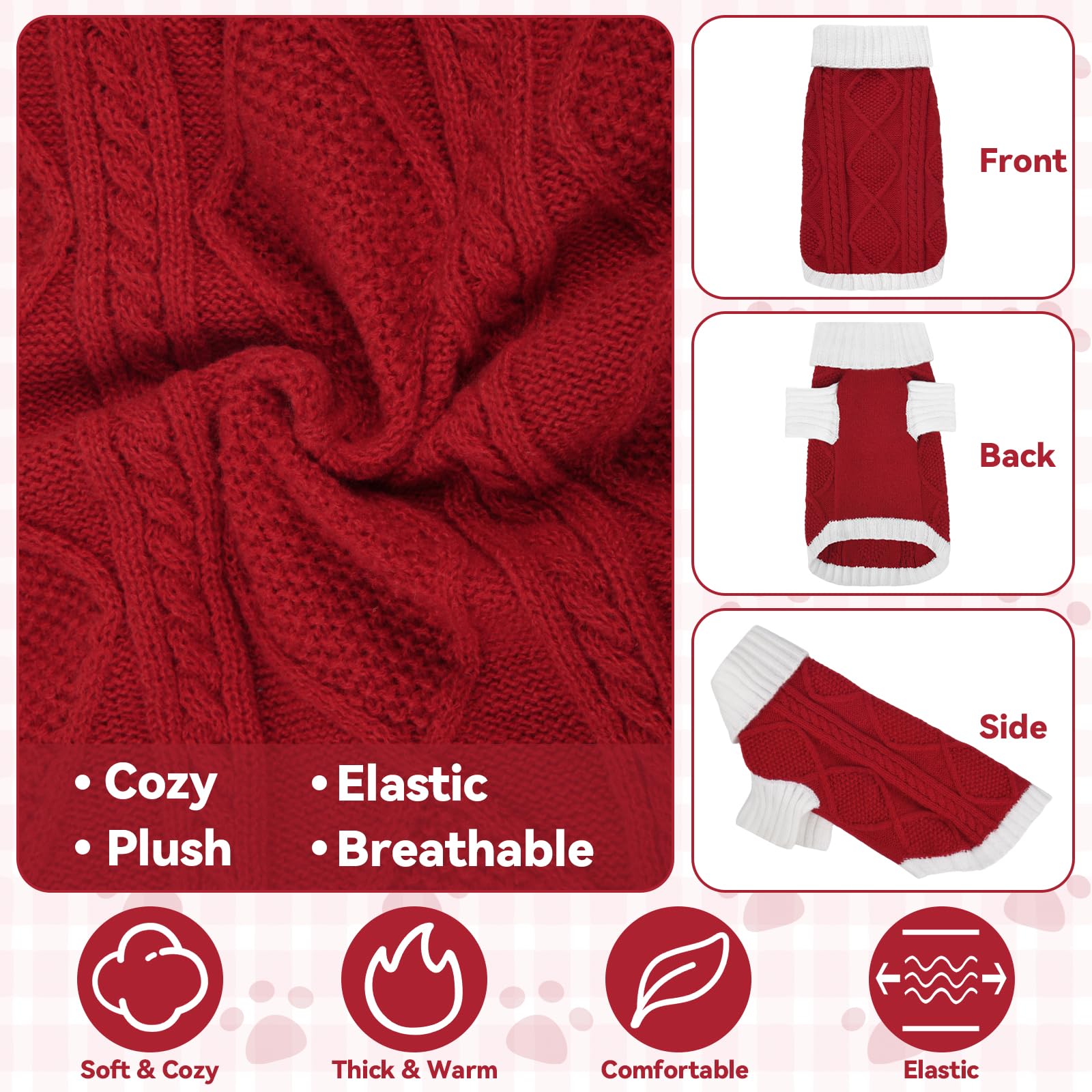 Celebrate the season with Lorehelinas stylish red-and-white knit dog sweater, crafted with classic argyle cable knit on the back and white ribbed half sleeves. This pullover sweater combines a charming holiday look with practical comfort. The soft acrylic yarn ensures warmth on chilly days, while the turtleneck and elastic knit keep the sweater secure and comfortable without restricting your pets movement. Perfect for Christmas, Thanksgiving, or family photos, this sweater is easy to slip on and off thanks to its pullover design and high-cut belly. Available in various sizes to fit small, medium, and large dogs including Boston Terrier, French Bulldog, and Mini Dachshund. Machine washable and built to last with double-stitched seams and anti-pilling fabric. A cheerful choice for festive celebrations and winter everyday wear.