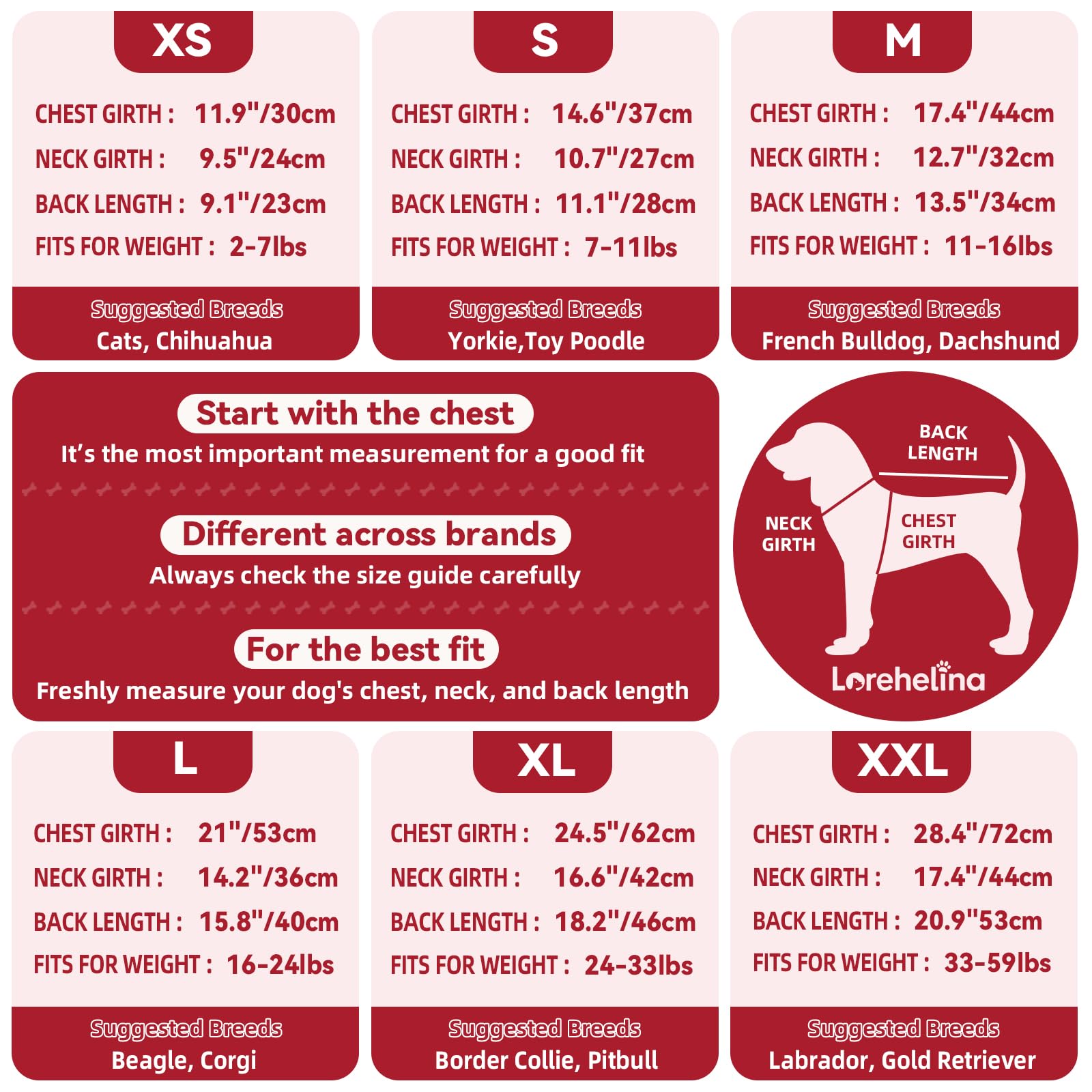 - This size does not fit medium or large dog breeds. Designed for 14.6" chest, 11.1" back, and 10.7" neck. Be sure to use chest girth as the main sizing reference. Best for Chihuahua, Maltese, Pomeranian, Poodle, Shih Tzu, Jack Russell Terrier, Miniature Pinscher, Havanese. If between sizes, we recommend going with the larger one.