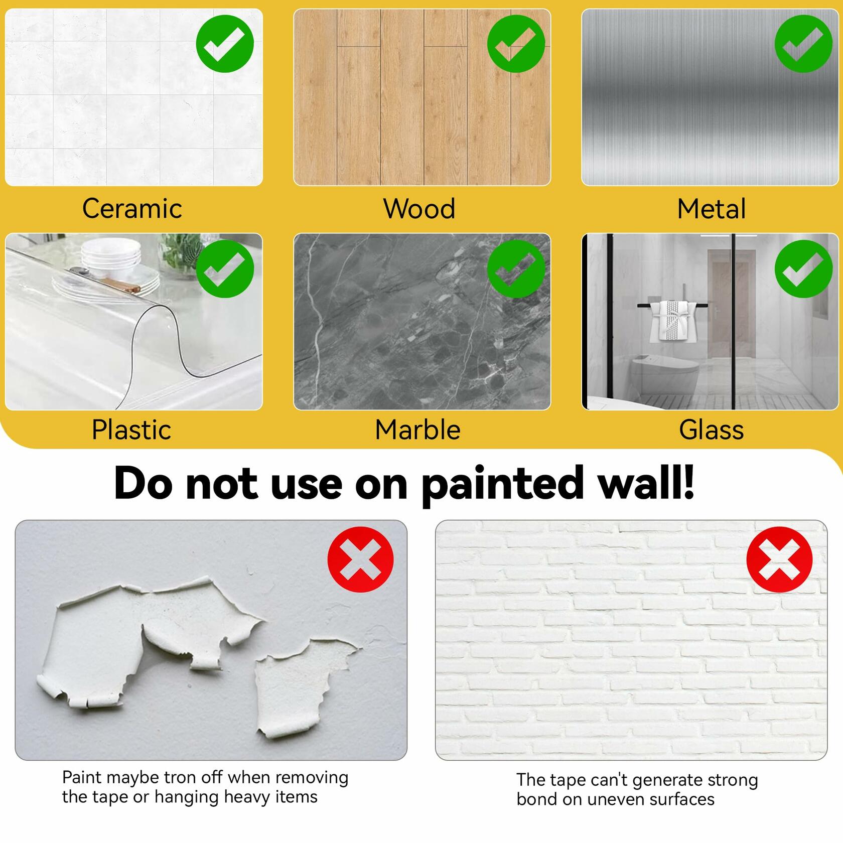 - Removable and No Residue: Our double sided tape heavy duty leaves no sticky residue and won't damage most surfaces upon removal such as glass, metal, plastic, marble, wood. No need to clean the mess like other kind of adhesive, totally renter or family friendly.