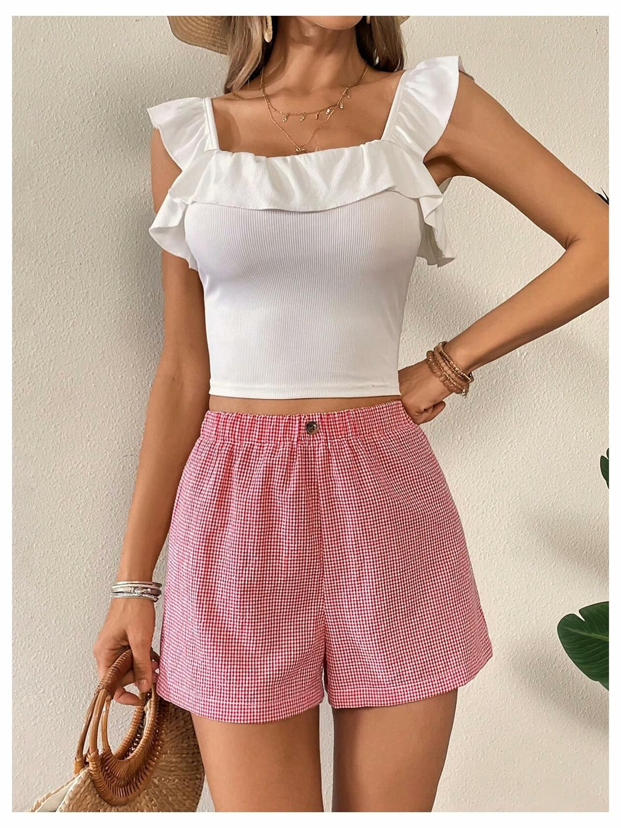 lVerdusa Women’s Plaid Elastic Waist High Waist Casual Shorts Red White XS