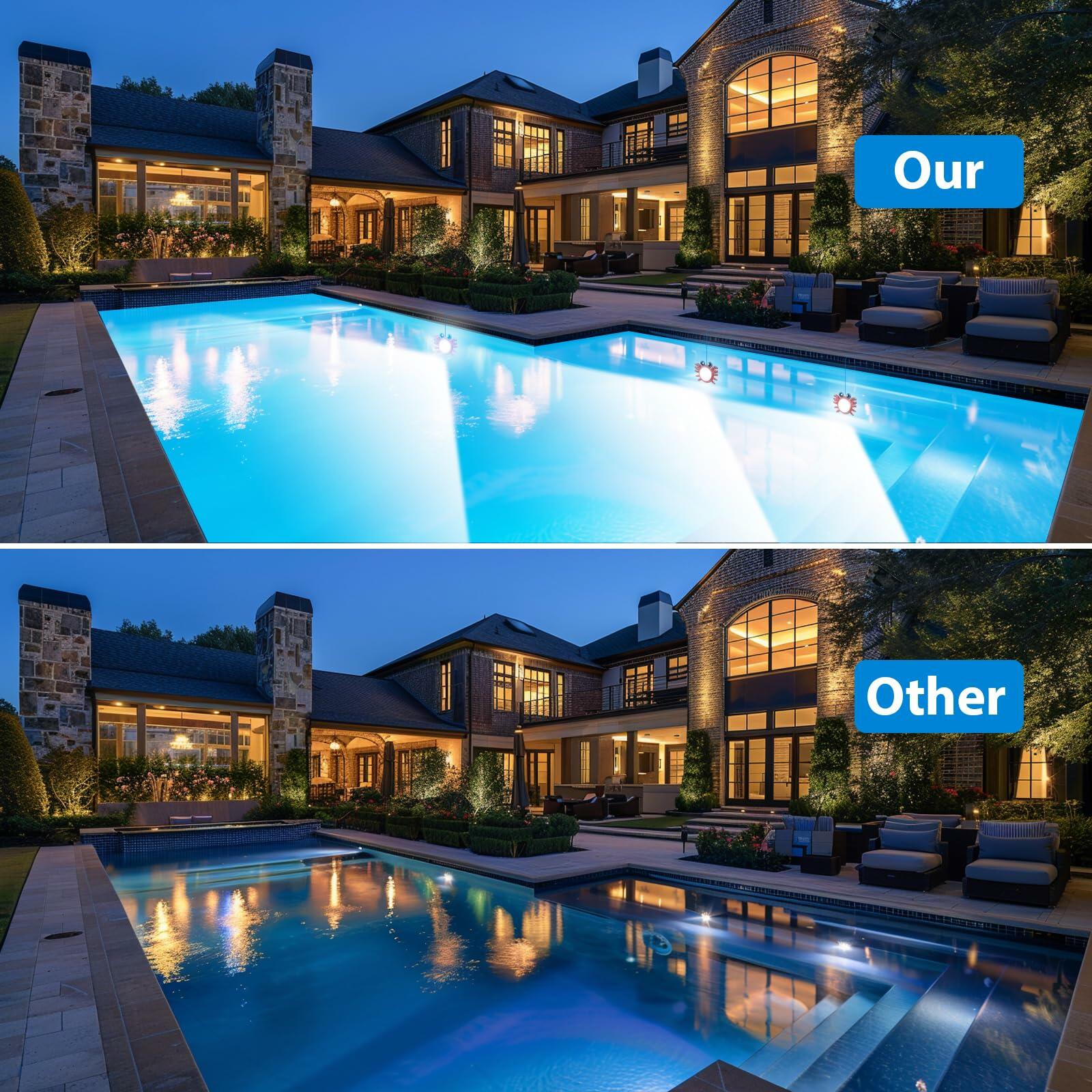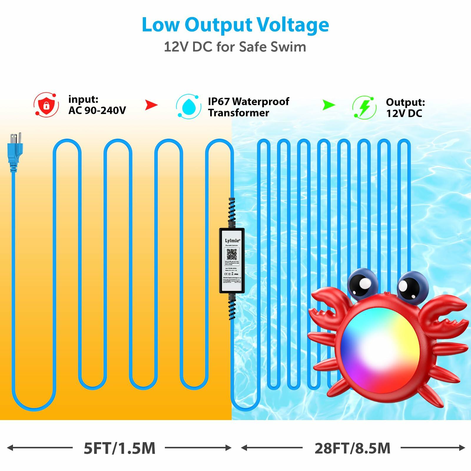 COLOR CHANGING LED POOL LIGHTS KITS BY LYLMLE A combination of dynamic and static LED pool lights for above ground pools control over 16 million colors to illuminate your pool at night. The controller's built-in microphone also responds to music from your cell phone or ambient sounds. The 800LM LED pool lights change color sync in response to ambient sounds or music, and the water in the pool becomes colorful, making your pool and garden more lively and interesting for your neighbors to compliment. MUSIC SYNC RGBW LED Pool Lights for Inground Pool feature the Smart Module: The new Smart Module and mobile app (can be downloaded for free) allows you to program a near unlimited number of colors. Multiple fixtures can be connected to a single Smart Module and controlled via mobile application on your phone. Submersible pool lights have IP68 waterproof rating, which allows swimming pool lights to stay underwater for long time. Power: 20 Watts Voltage : Input AC90-240V , Output 12V Beam angle: 140 Luminous Intensity: 800 Lumens Cable: 33 Ft Cord + Built-in Transformer with Timer Light Color: 16 Million Colors available Working Condition: Underwater Use ONLY