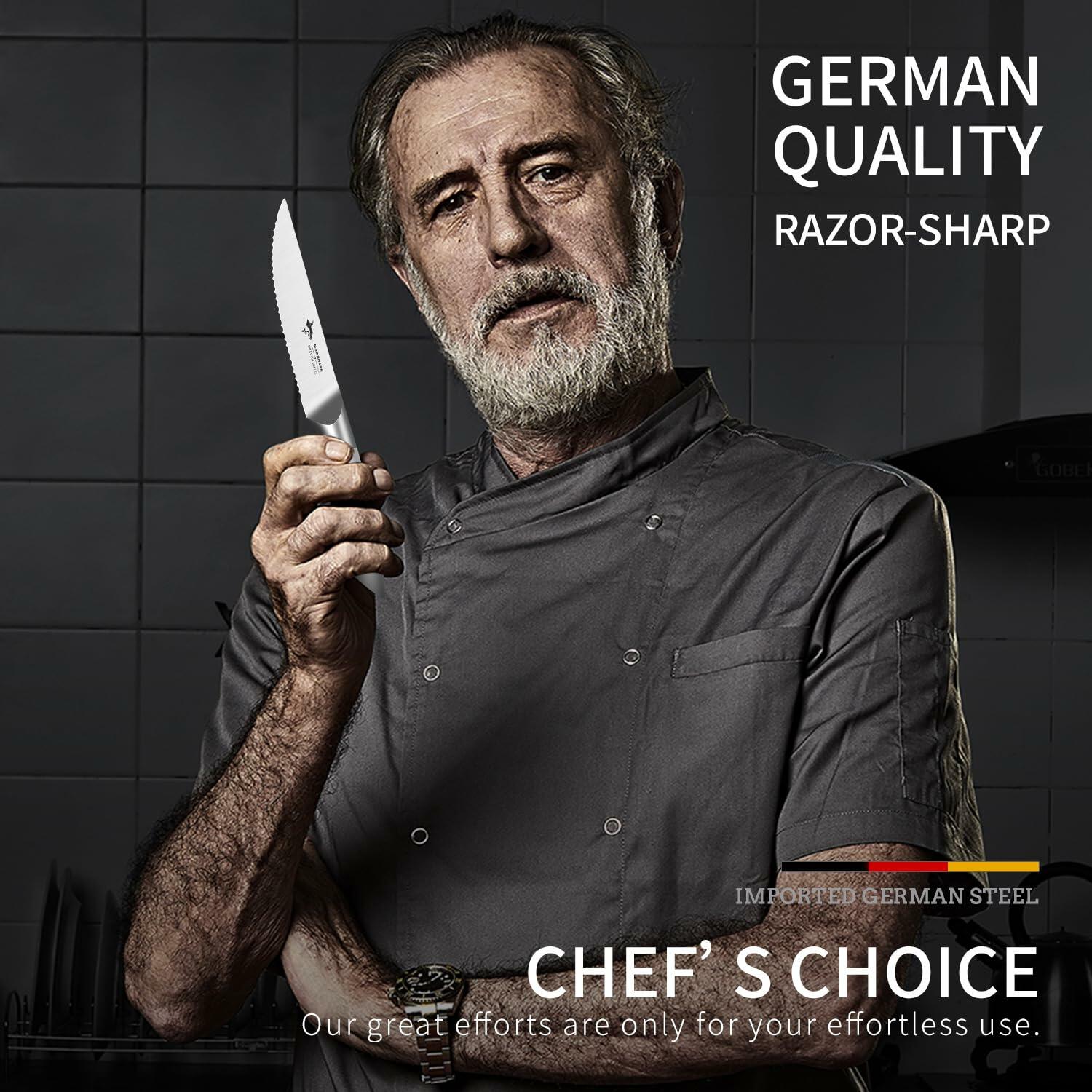 - 【Designed specifically for meat lovers】 Crafted specifically for steak enthusiasts, our knives are made from ice-hardened steel to ensure long-lasting sharpness. The meticulously crafted 5-inch precision cutting edge and hollow-ground design effectively reduce sticking, ensuring perfectly sliced steak every time