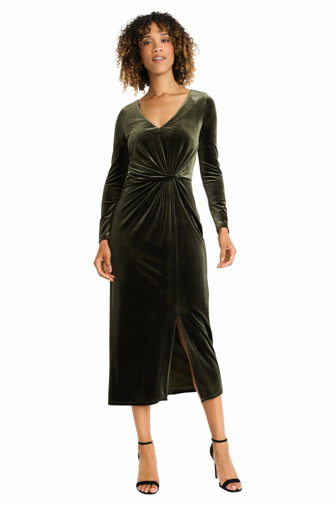 Maggy London Women's V Neck MIDI Dress Draped Knot Waist Slit Rosin Size M
