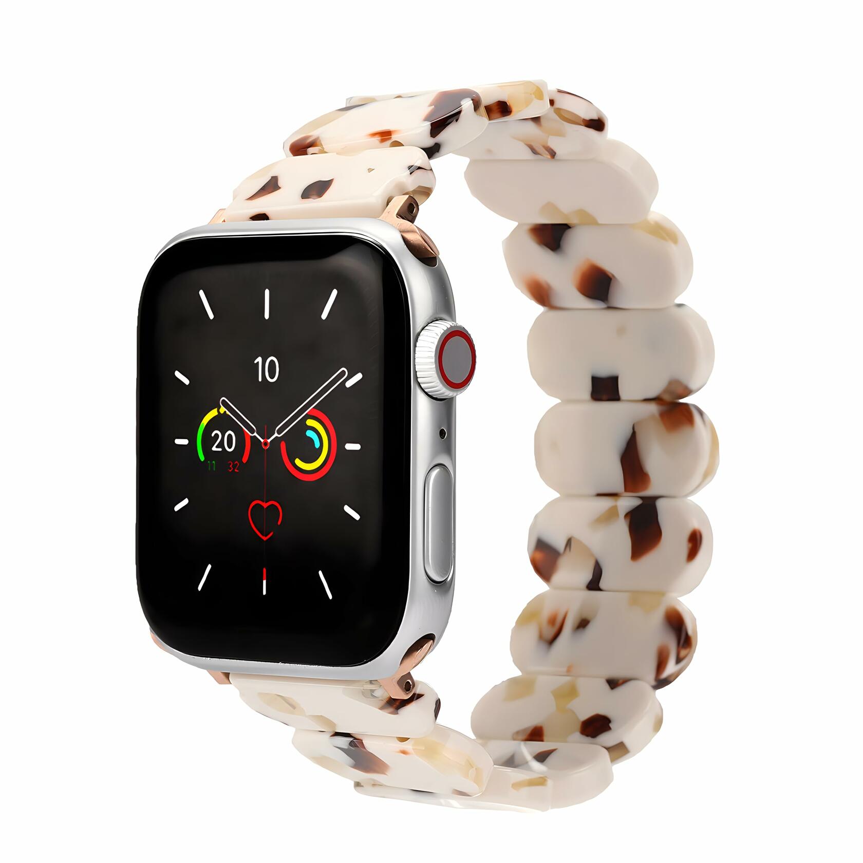 This stretchy resin watch band compatible with Apple Watch. The lightweight elastic band with stretchable design for a comfortable and flexible fit on various wrist sizes. Constructed with enduring resin material, the watch band is waterproof and sweat proof so it can handle anything from errands to workouts. Its subtle tortoise pattern looks elegant yet versatile, matching well with both casual and dressy outfits. The stretch watchband is compatible with all Apple Watch models so it's a great accessory for any iWatch owner looking to switch up their style. Just stretch it onto your watch for a lightweight, water-resistant option that's comfortable enough for all-day wear.