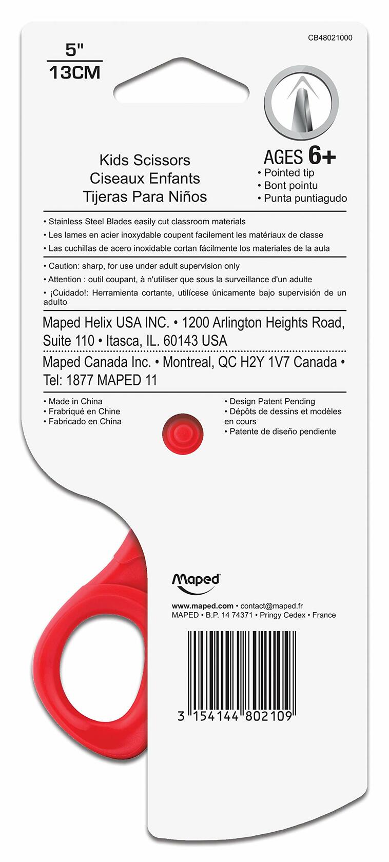 Maped Essentials Kids School Scissors are perfect for young students going back to school! Modern 5" / 13cm design features Pointed Tip Stainless Steel Blades with a rounded tip that is safer others you can find on the market and are much more appropriate for young students. Eye-catching asymmetrical handles are perfect size for young hands to hold, and are perfect for students 6+ years old. Sold in assorted colors Blue, Light Blue, Red or Green (no color choice).