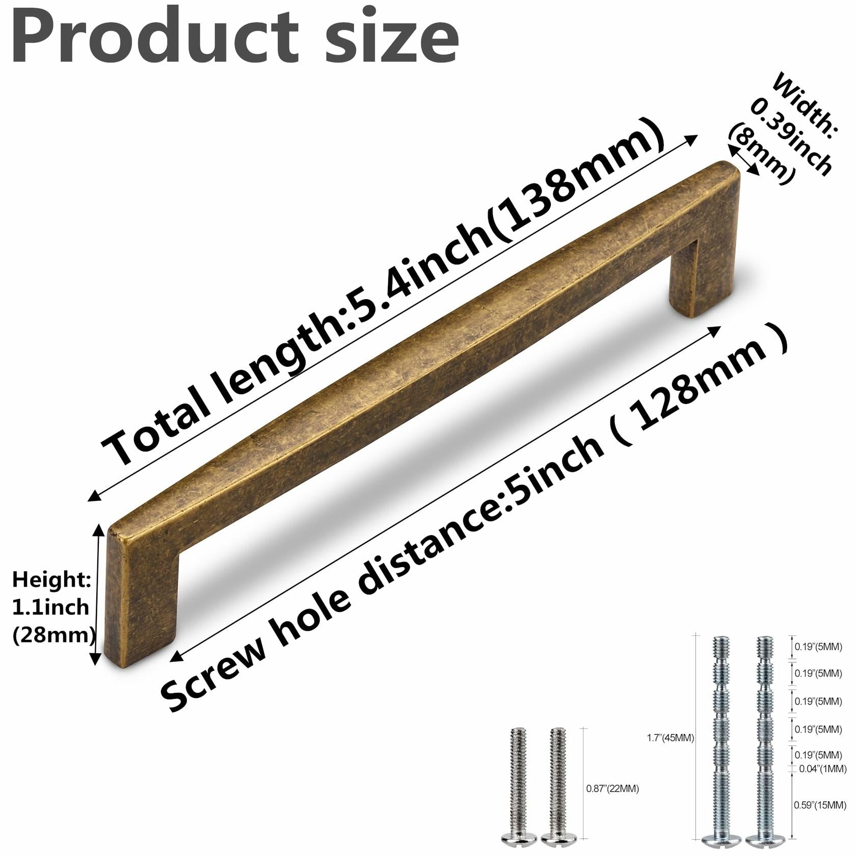 - Size: Hole Centers(CC): 5 Inch(128mm); Overall Length: 5.4 inch(138MM); Diameter: 0.39 inch(8mm), Height: 1.1 inch(28MM); . Please check the size of the kitchen handle you need carefully before you buy.