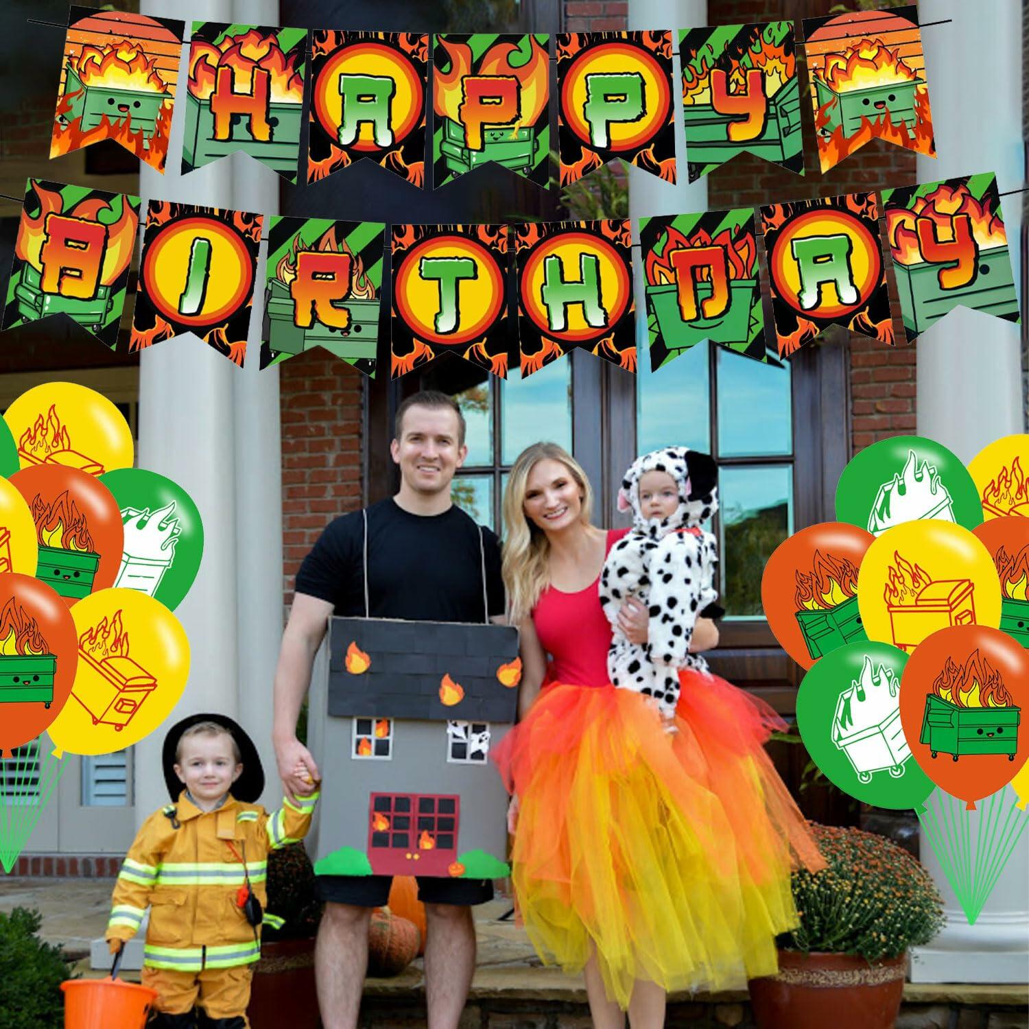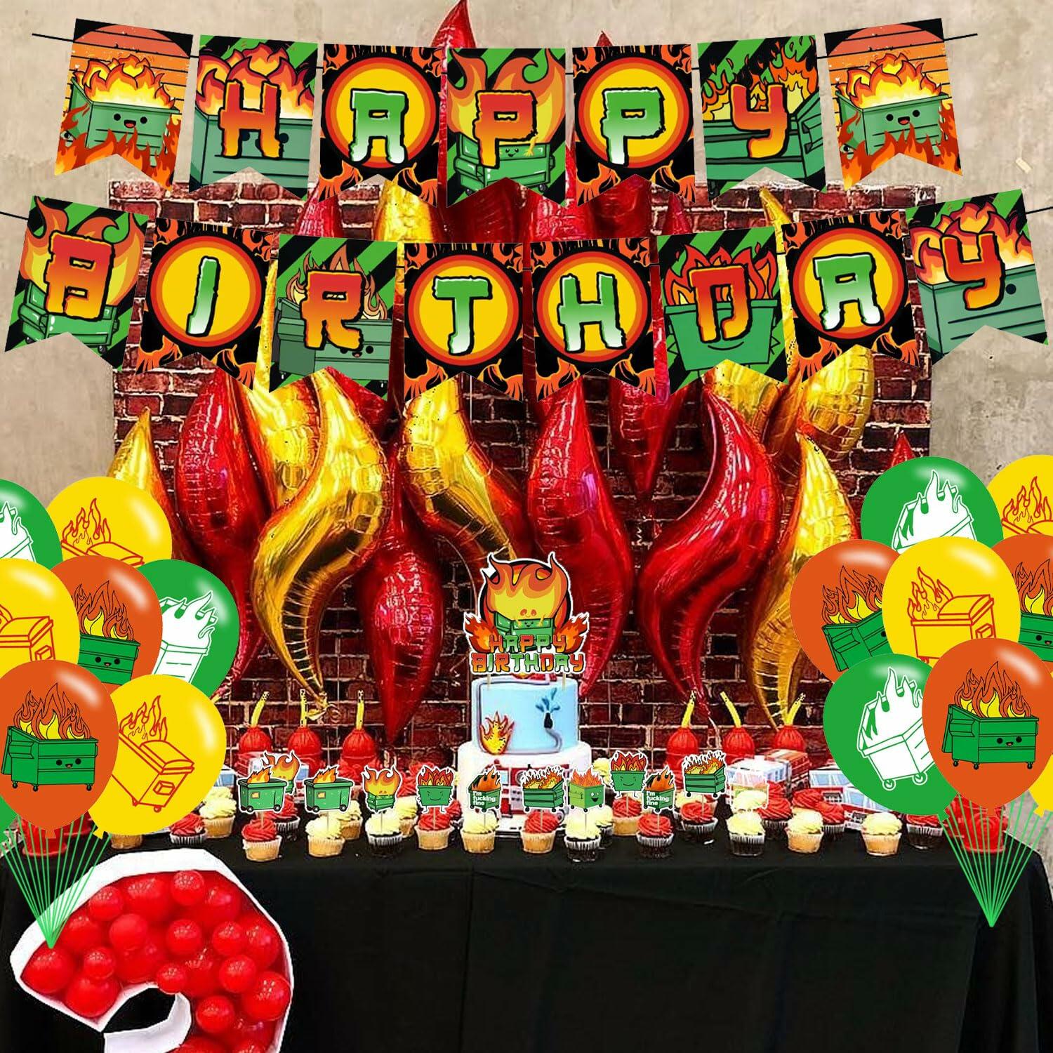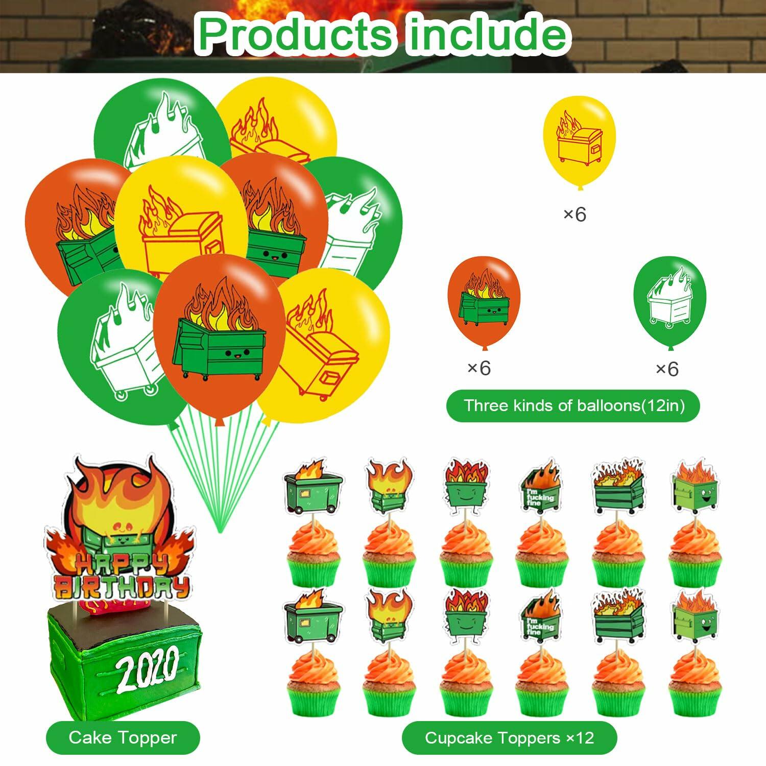 - Dumpster fire Package Includes: 1 pack happy birthday banner, 18 pcs latex balloons(3 color), 1 pcs cake topper, 12 pcs cupcake topper(6 styles). Our full set of Dumpster fire birthday party supplies will add surprises to you, your family and friends.