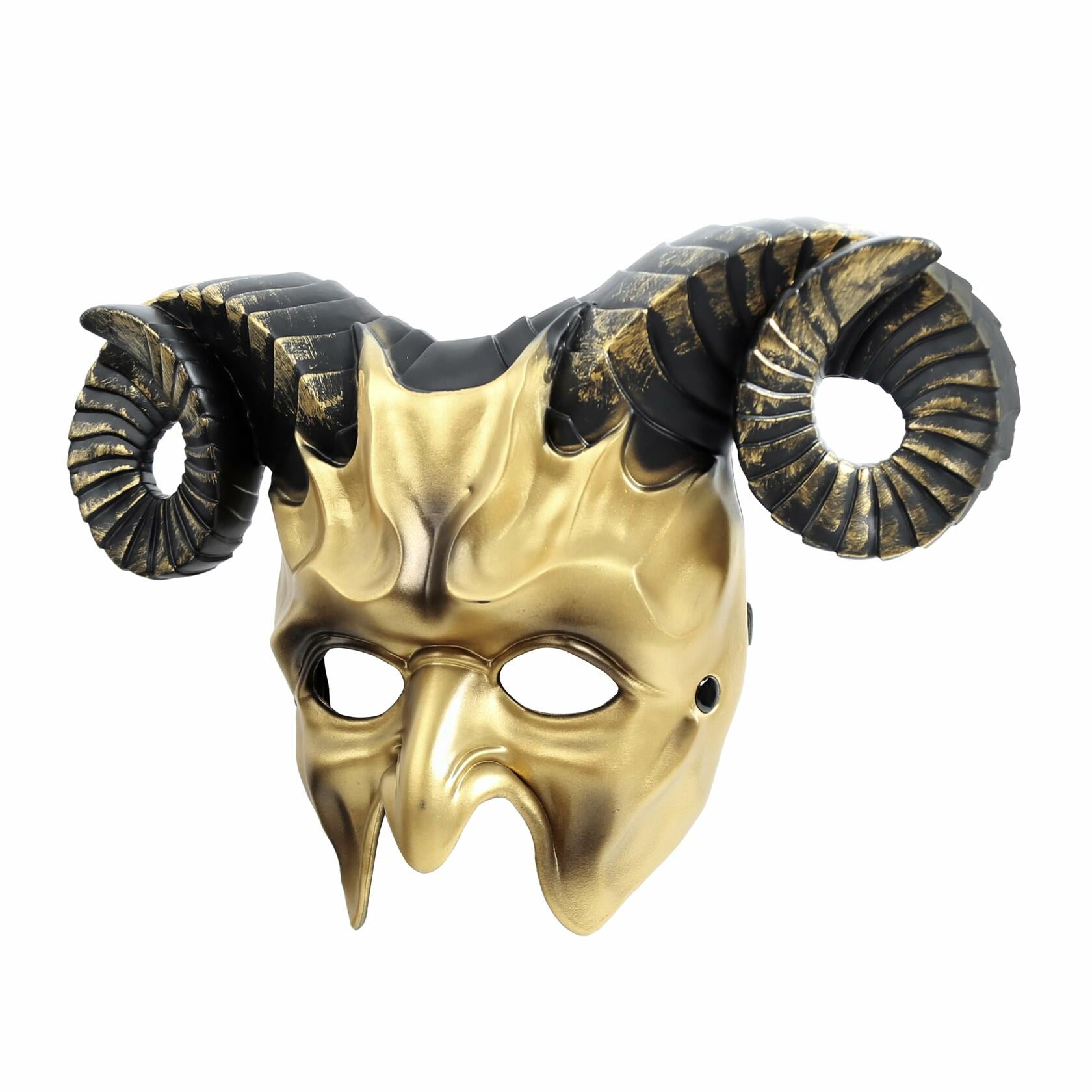 - DESIGN FEATURES: Half-face devil goat mask with prominent curved ram horns, featuring intricate details and a menacing appearance perfect for Halloween and masquerade events