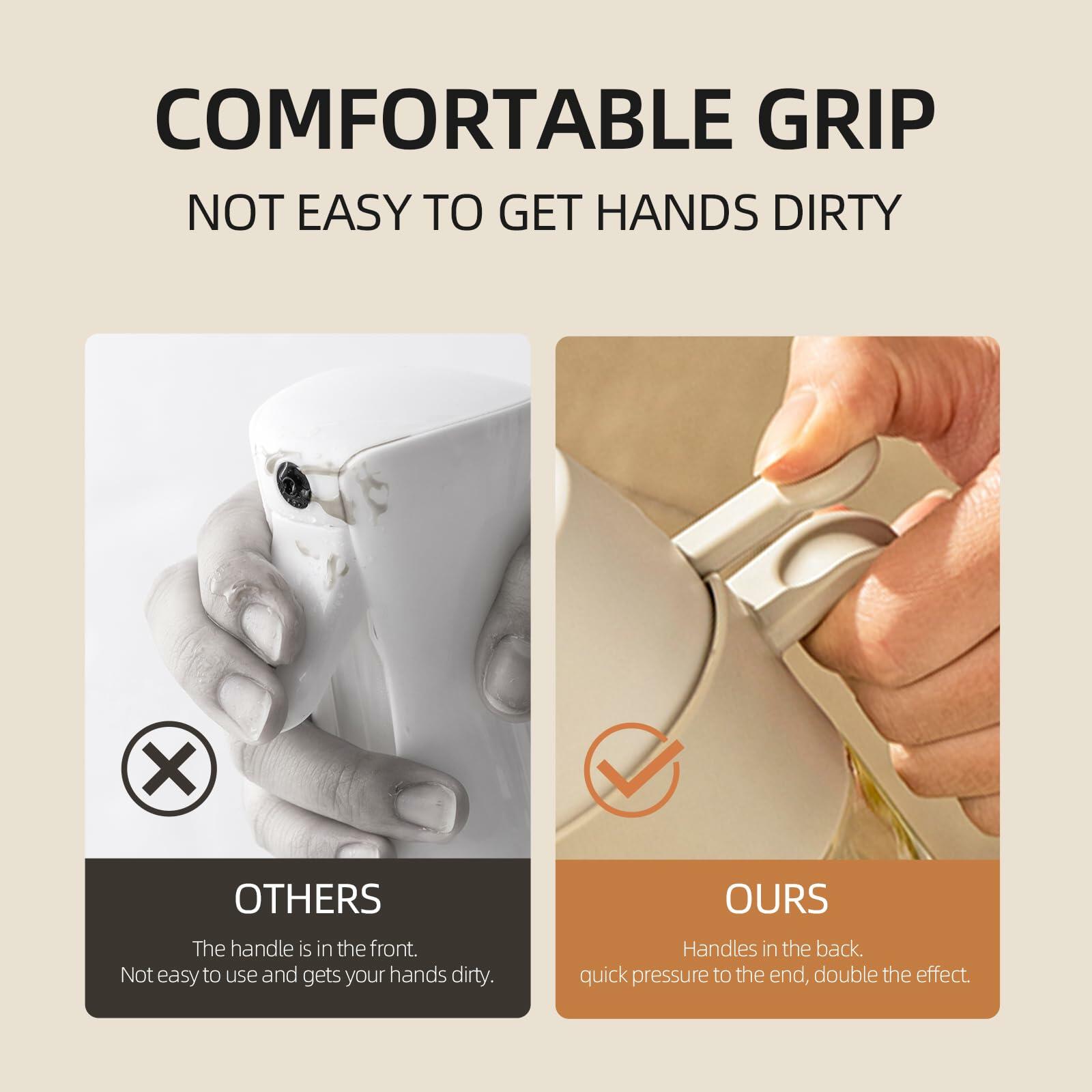 - Not Dirty Hands Design: Olive oil spray bottle is designed with the front-facing, prominent nozzle and the rear comfortable handle design enables users to achieve a fine, uniform, pure mist, users can pour or spray oil without getting their hands dirty