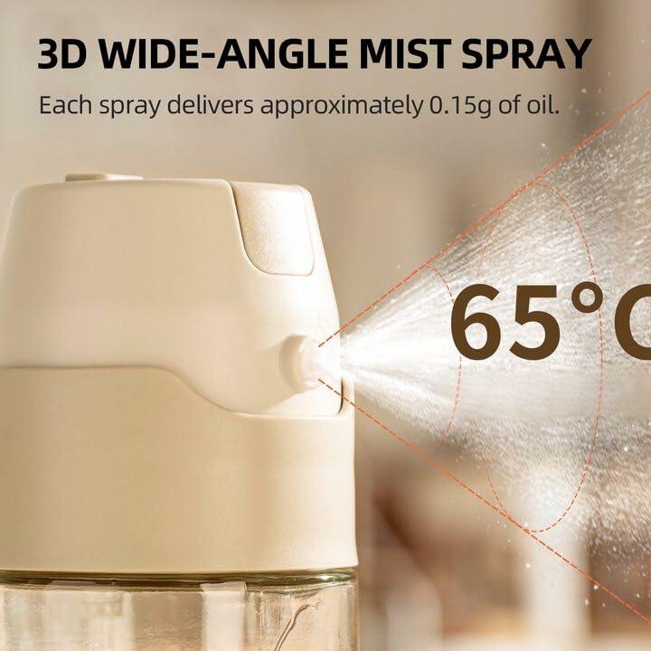 - Precise Oil Control: Our olive oil sprayer delivers a consistent, ultra-fine spray with an advanced fan-spray atomizing nozzle to provide precise oil mist for even coverage; Each spray dispenses approximately 0.5 grams of oil, which is easily to control and measure your daily oil intake