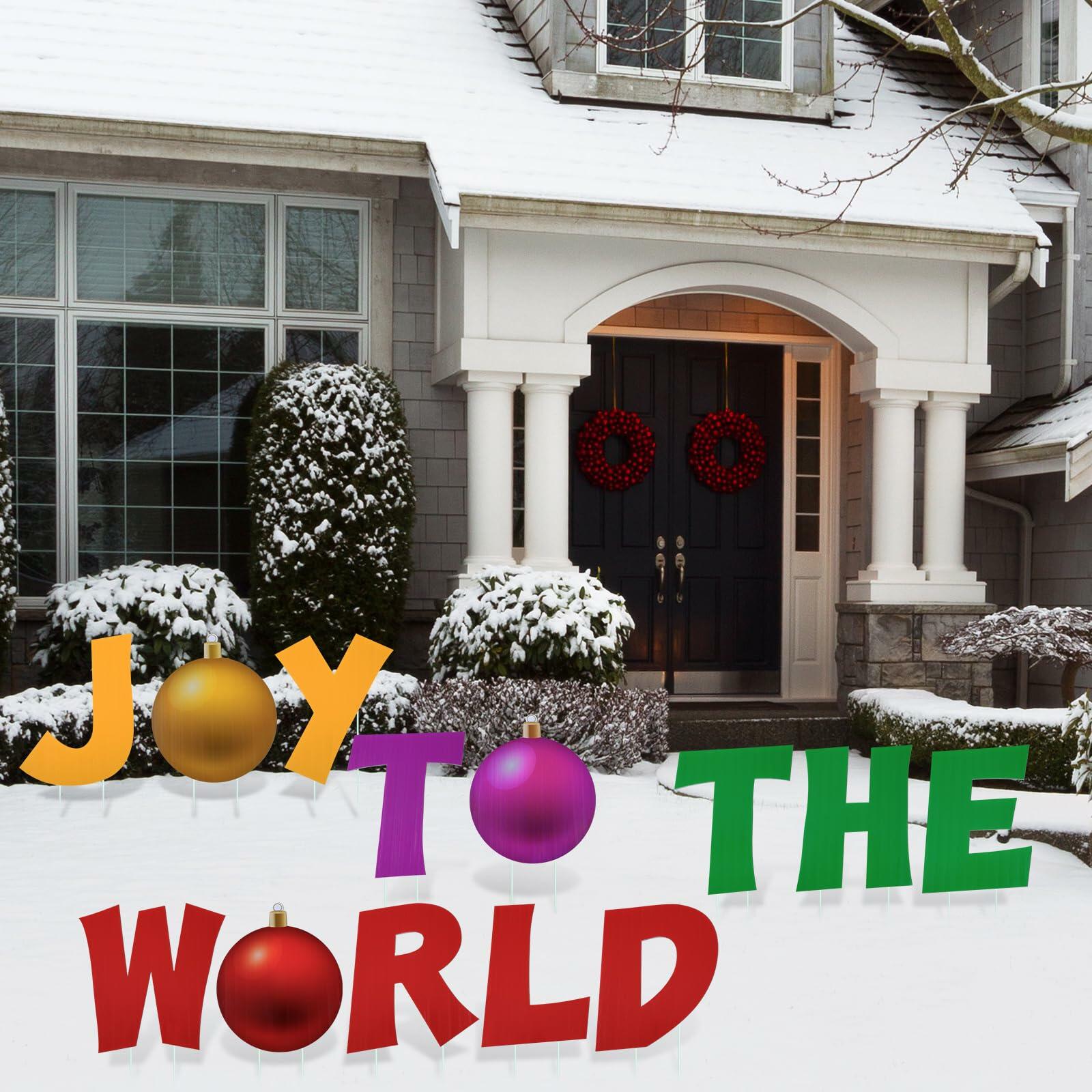 - Joy to the World Yard Signs Package Content: you will receive a pack of 13 Christmas letter yard decorations, and 26 plastic stakes, the letter signs are printed in four distinctive colors, yellow, purple, green, red, colorful colors to create a cheerful atmosphere for your yard, replace the letter o with a Christmas ball shape for a more lively look, to your family and neighbors to spread a pleasant Christmas mood, for your home and yard to add a strong atmosphere of the Christmas holiday