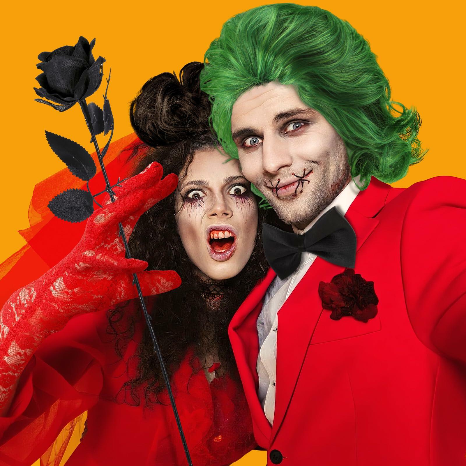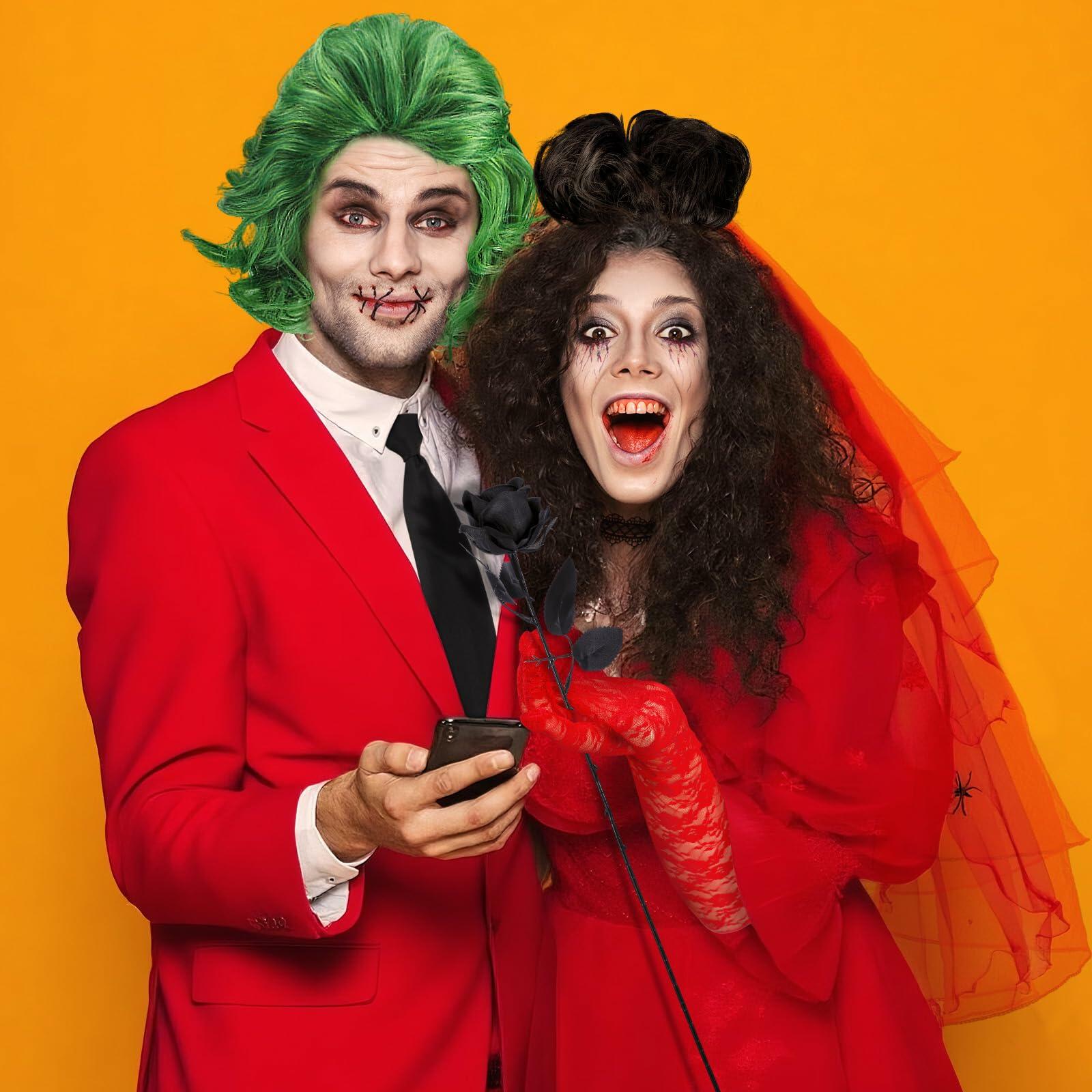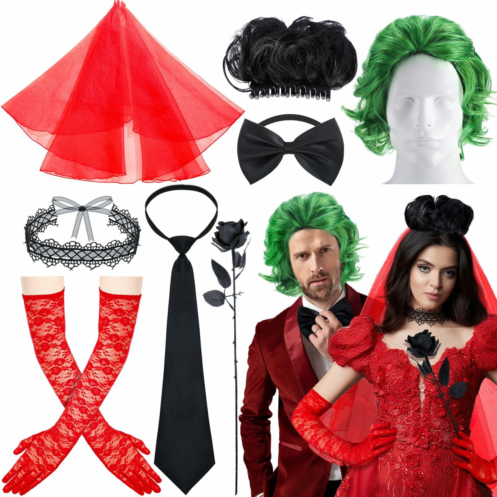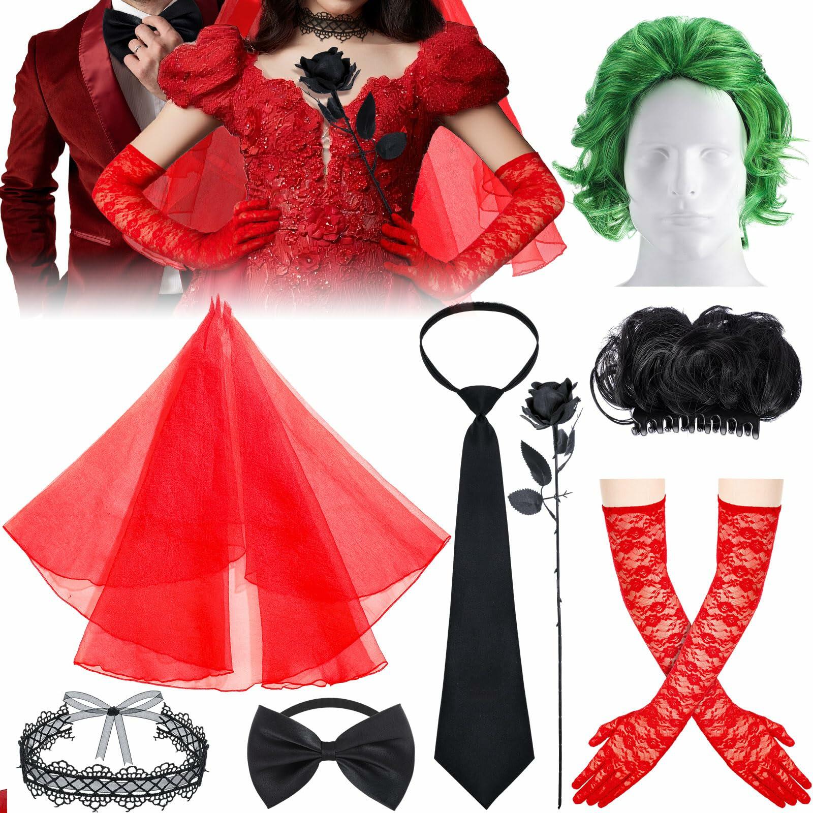 - Halloween Wedding Costume Accessories: you will receive 8 items, 1 black wig, 1 bride necklace, 1 red veil, 1 wedding sleeve and 1 fake rose; 1 man green wig, 1 tie and 1 bow tie; A perfect combination, enough to meet your gothic wedding costume needs