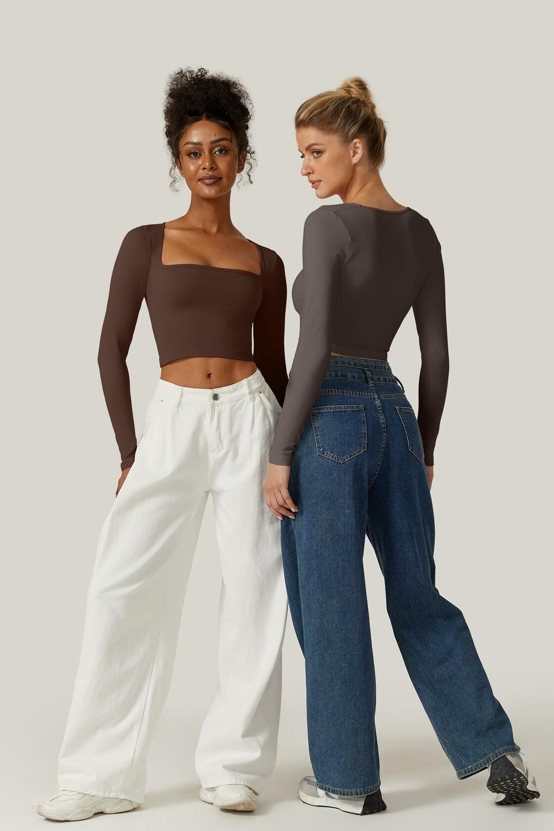 Meyeeka Women's Cinnamon Seamless Cropped Yoga Top Long Sleeve Square Neck - L