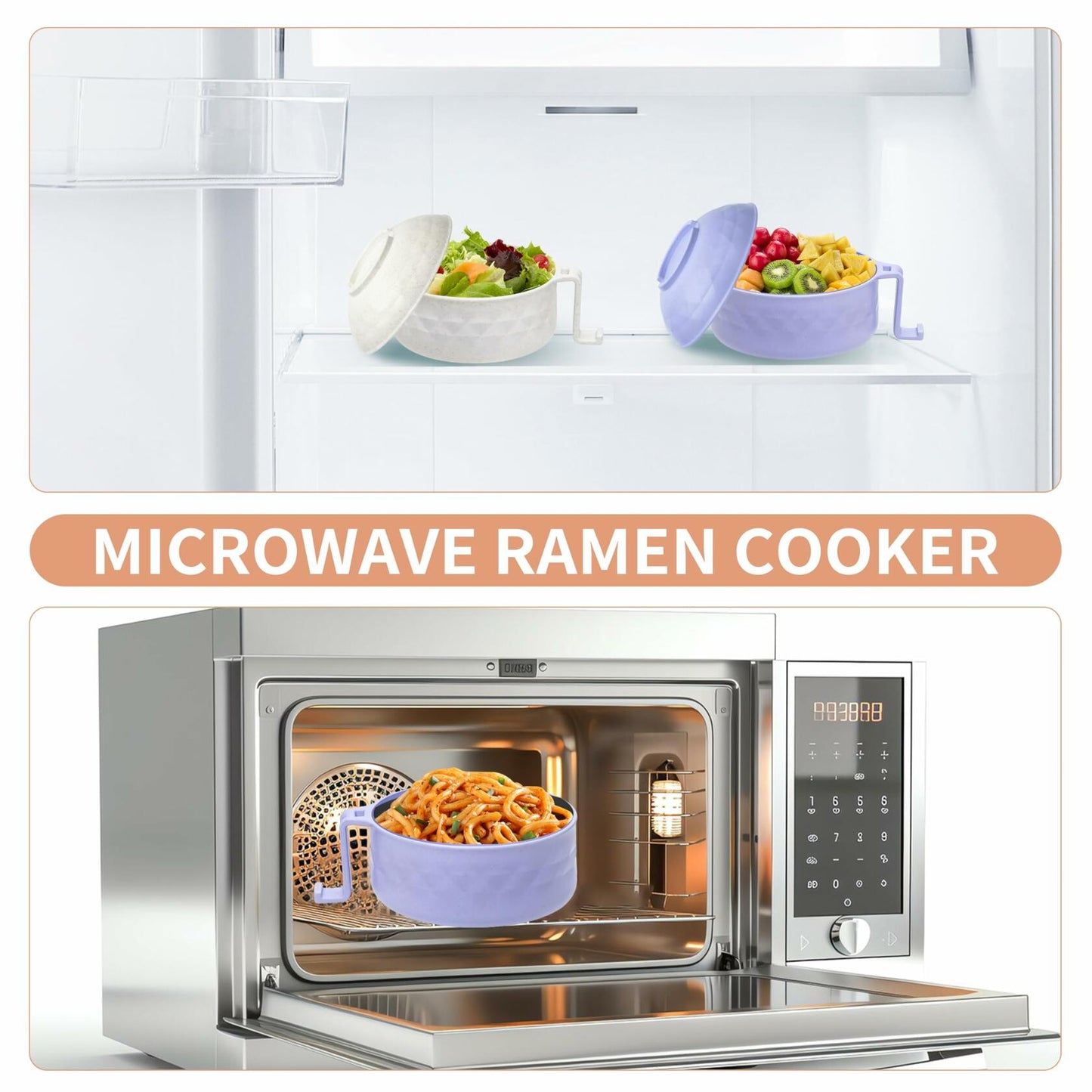 Microwave Ramen Bowl Set of 2 w/ Strainer Lid Chopsticks Phone Holder Purple