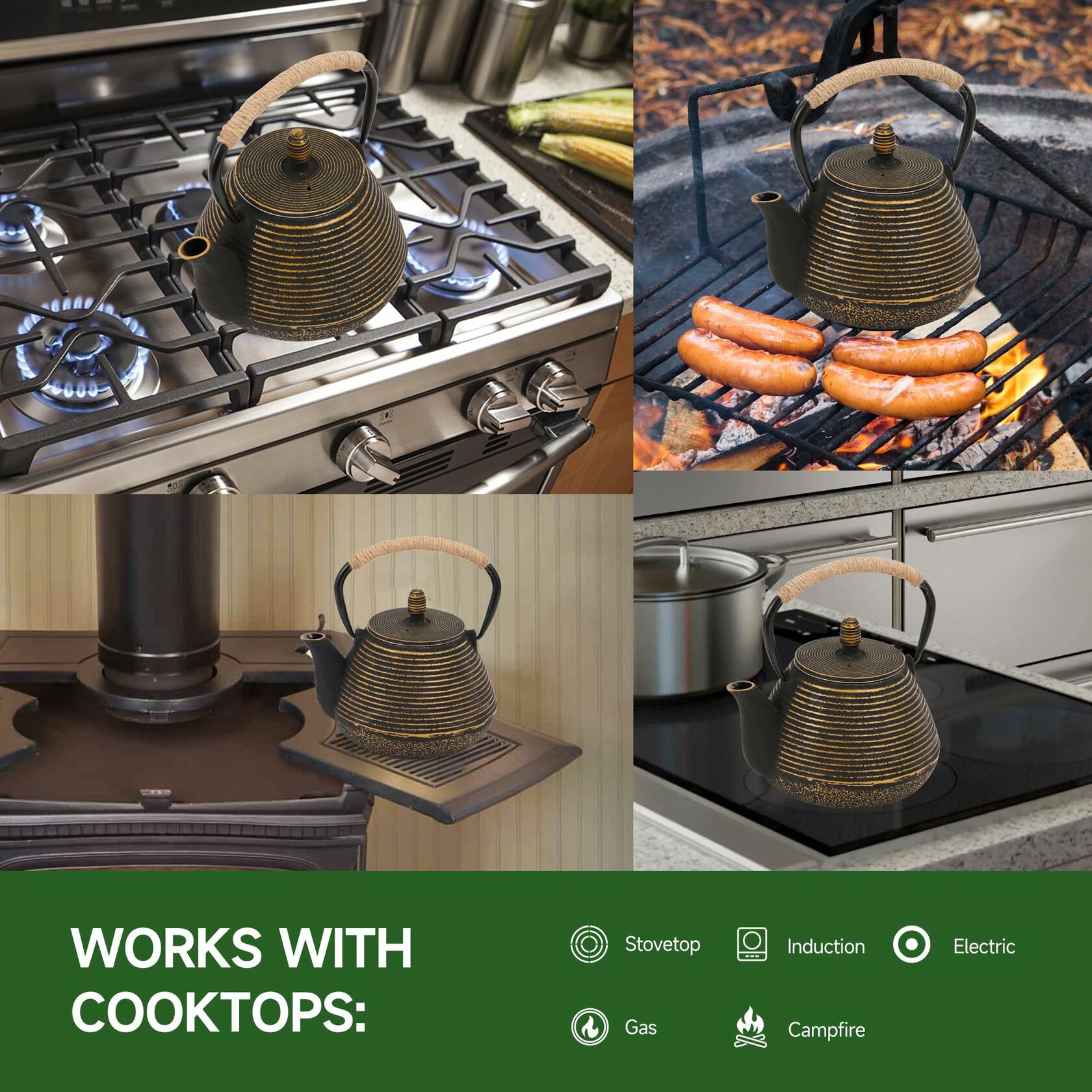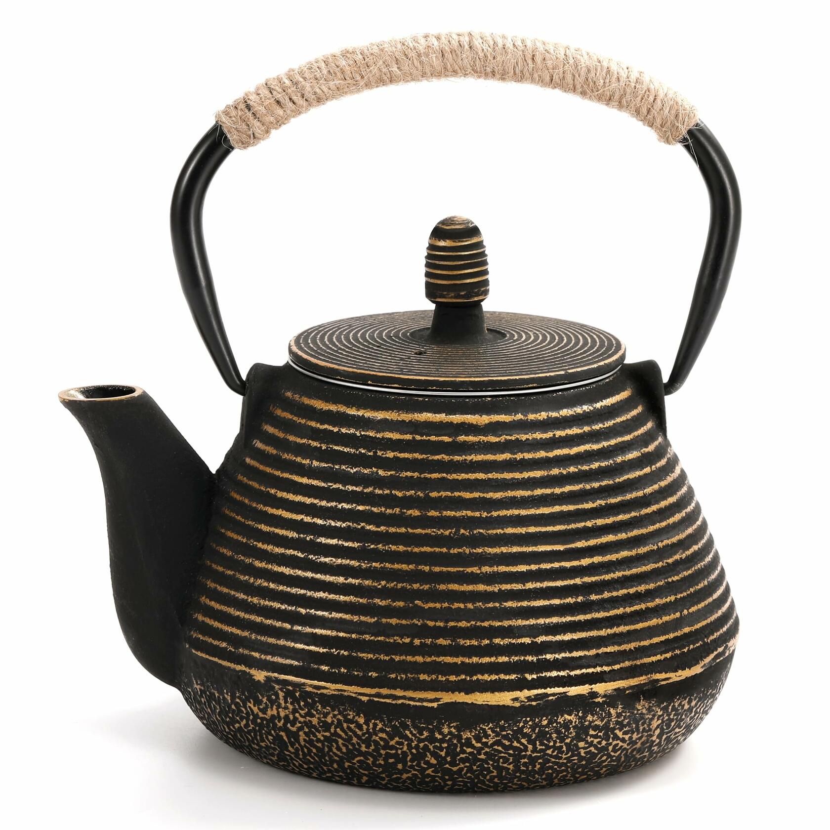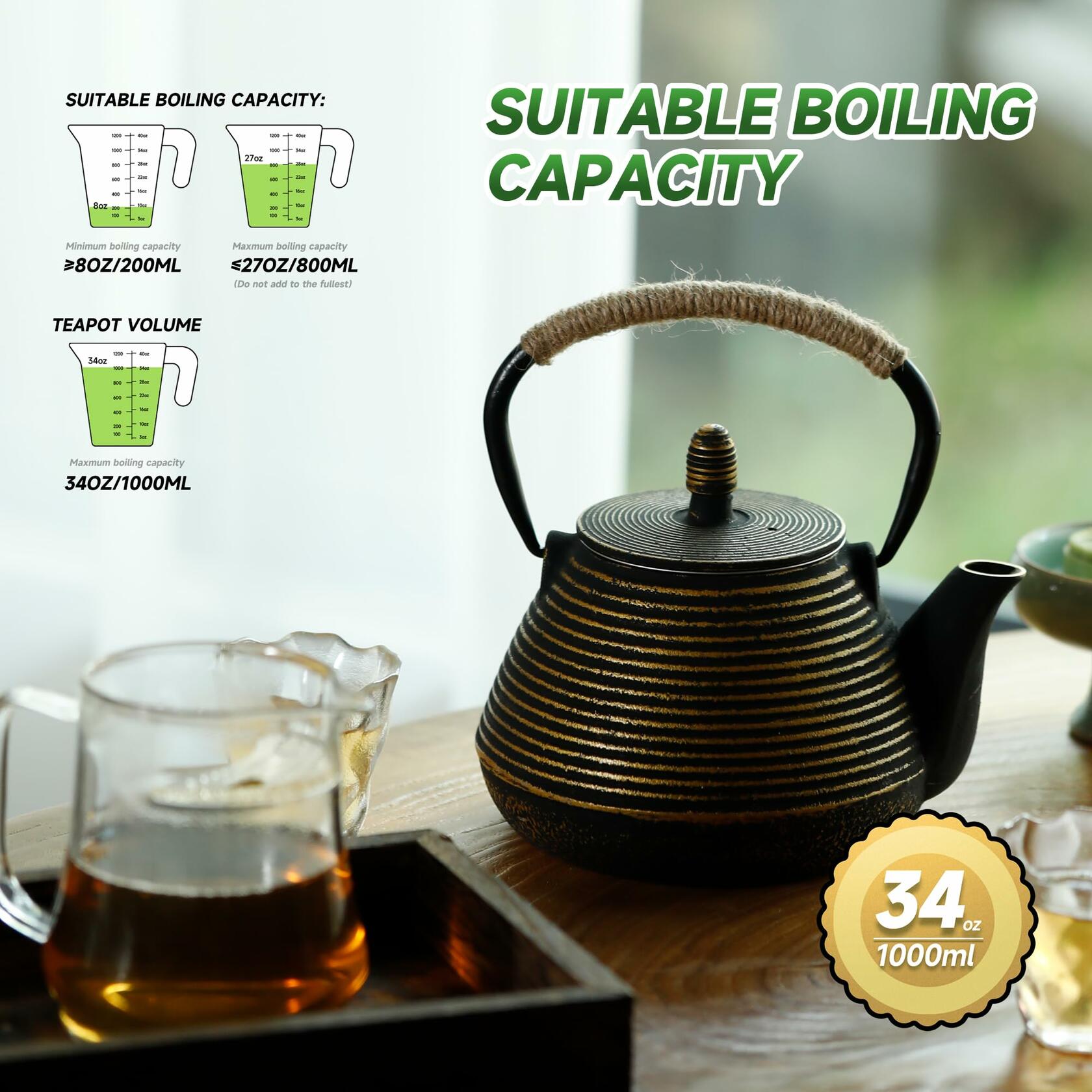 The Cast Iron tea kettle with infuser is made by traditional cast iron craftsmanship. This teapot with infuser adopts the optimal capacity of 34oz, which can make or boil tea. Whether you are a lover of scented tea or loose tea, tea kettles will make a good companion for your tea drinking. The stovetop tea kettle allows gradual and even heating. It will help infuse the greatest amount of flavor from the tea leaves into the water. Tea pot for stove could break down the elements of Fe2+, which is beneficial to your body. Japanese cast iron teapots also have long heat preservation. The material of stovetop kettle is sturdy and protects the teapot from being damaged easily, which greatly extend the life of tea pots. The tea infuser kettle helps separate the tea leaves from the water and can be easily removed and cleaned. Food-grade enameled interior ensure that it is rust and corrosion resistant. Elaborately designed loose leaf tea kettle is decorative for kitchen, living room, office, make your life lively; also a nice gift for birthday, housewarming, wedding, Halloween, Thanksgiving Day, Christmas, anniversaries.