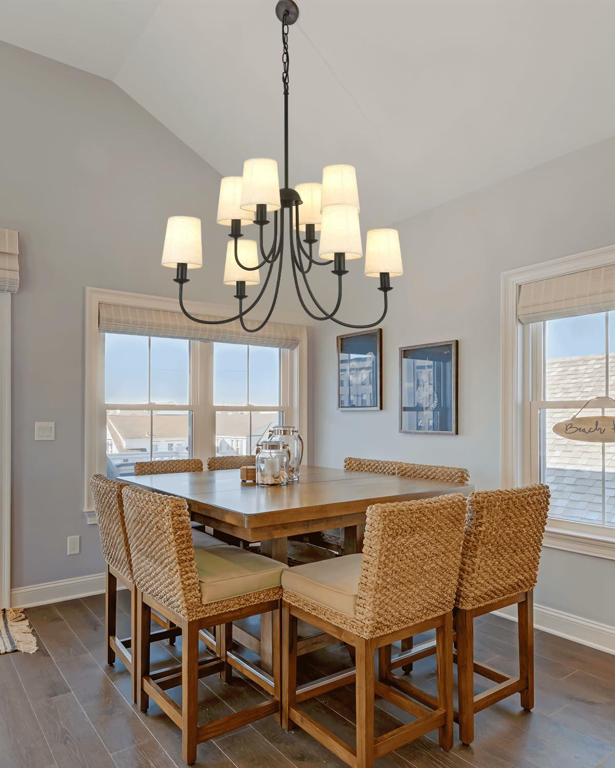 - METICULOUS CRAFTSMANSHIP: The 8-light modern chandelier is welded with high-quality metal materials, which do not easily rust and the paint does not easily fall off, ensuring safety and durability for long-term use. The black lamp adopts a linen fabric lampshade to create a relaxing and comfortable atmosphere while protecting your eyes.