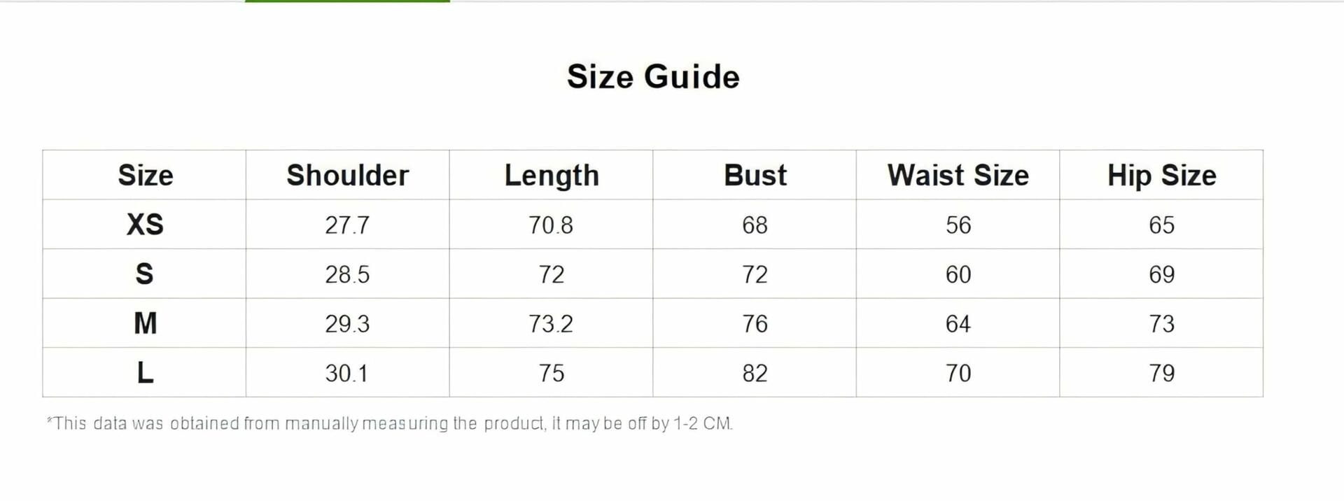 Size Chart(Product Measurement): X-Small: Height: 63-65", Bust: 32.3-33.9", Waist Size: 24.4-26", Hip Size: 34.3-35.8" Small: Height: 65-66.9", Bust: 33.9-35.4", Waist Size: 26-27.6", Hip Size: 35.8-37.4" Medium: Height: 65-66.9", Bust: 35.4-37", Waist Size: 27.6-29.1", Hip Size: 37.4-39" Large: Height: 66.9-68.9", Bust: 37-39.4", Waist Size: 29.1-31.5", Hip Size: 39-41.3" X-Large: Height: 66.9-68.9", Bust: 39.4-41.7", Waist Size: 31.5-33.9", Hip Size: 41.3-43.7"