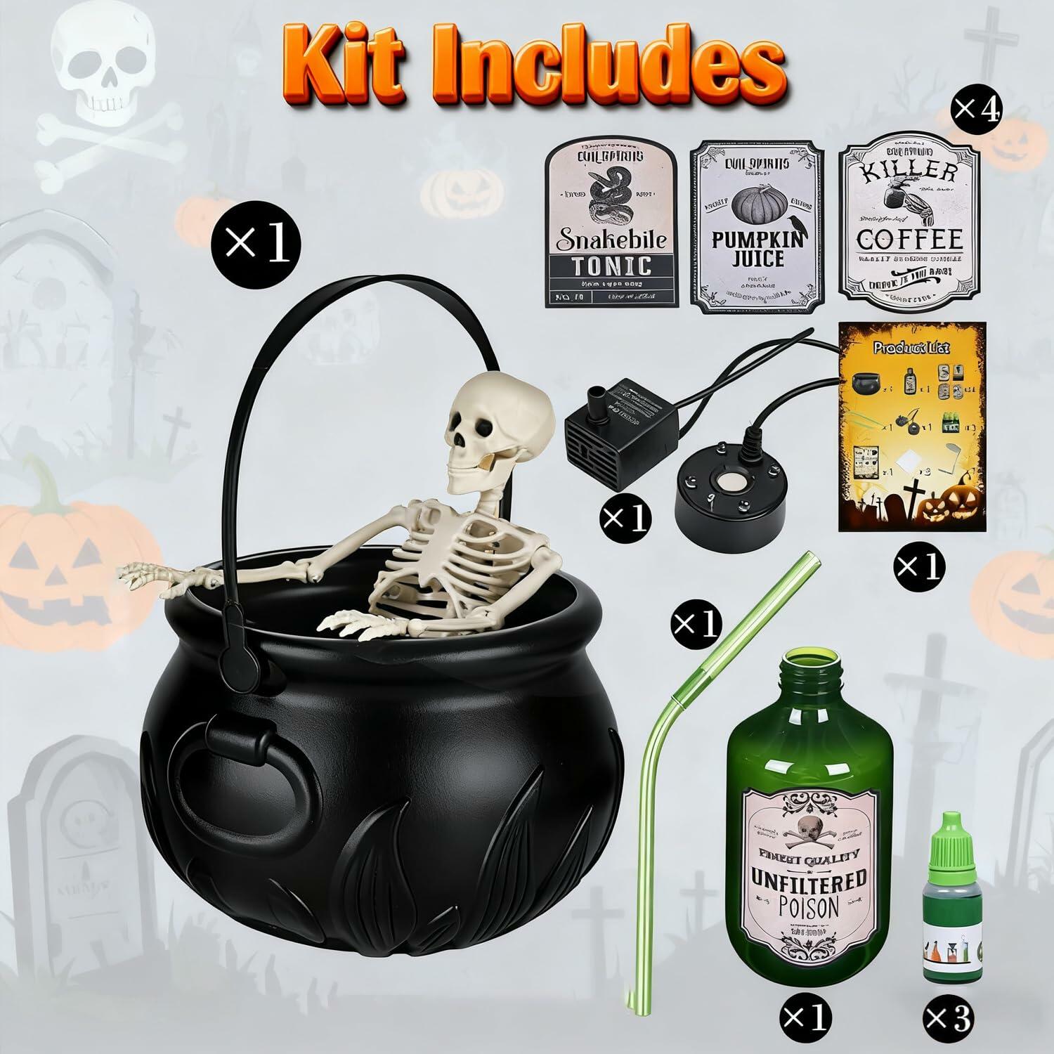 - 【Easy to Use】: Simply follow the instructions,Just fill the witch's cauldron with clean water, pop in the tubes and fog maker, and add the special dye water bottle. Watch the magic happen! The bottle floats above the cauldron, magically refilling itself to release an eerie green glow and creepy mist.