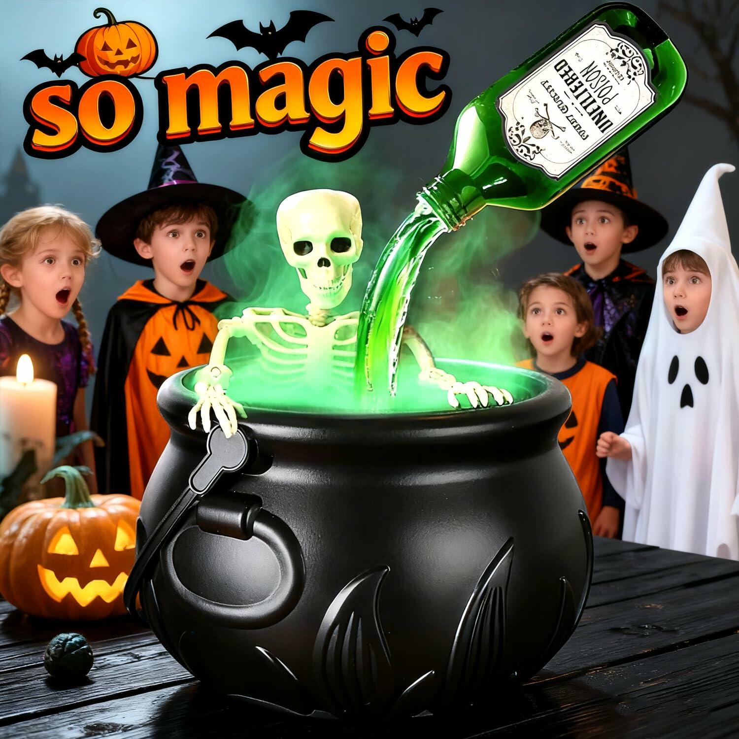 Large Cauldron Halloween Decor with Skeleton, Magic Floating Potion Bottles & Diffuser - Halloween Decorations Indoor- Black Witches Cauldron Bowl Hocus Pocus Decor for Home Room Kitchen Decor