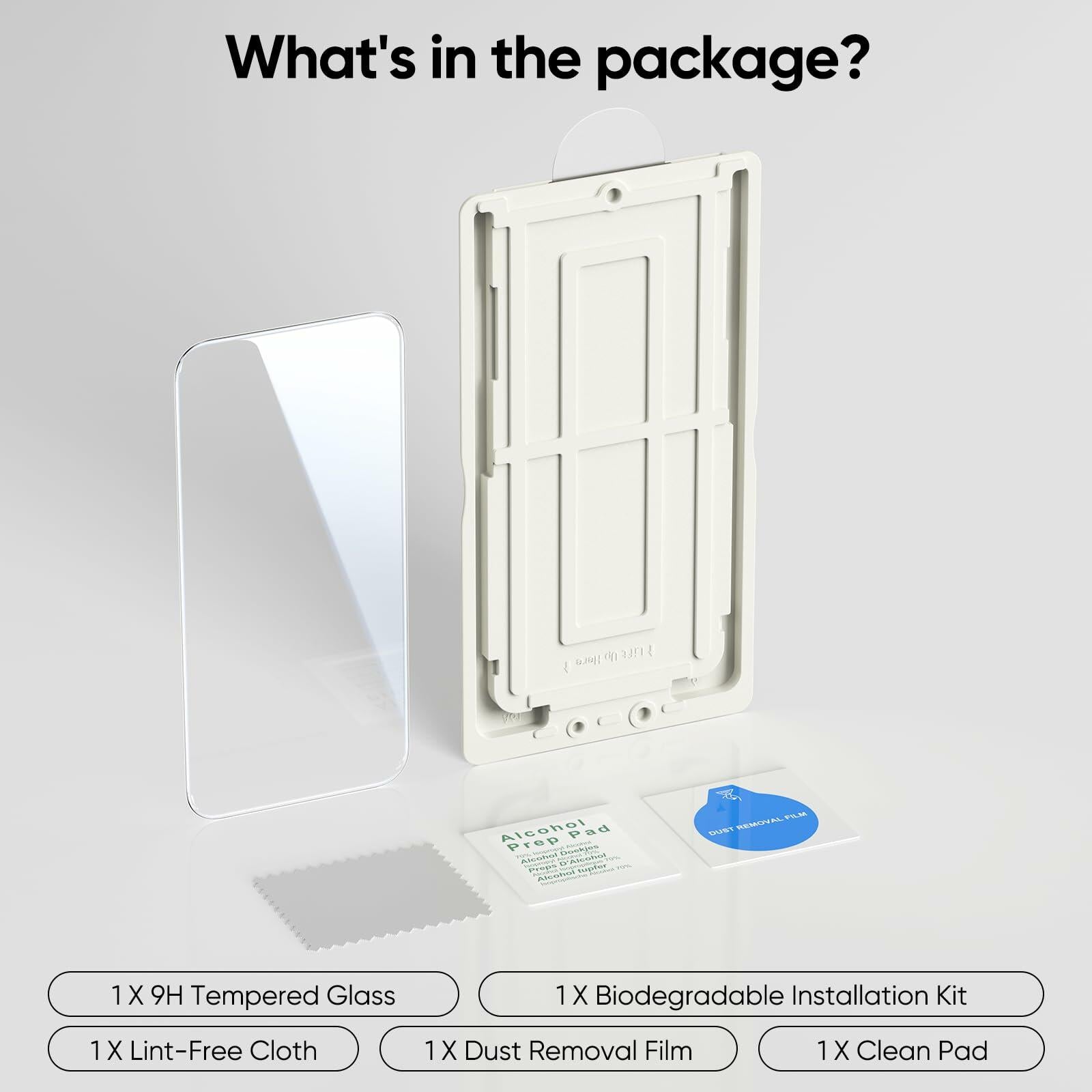 - Bio-Based Design - Made from bio-based materials from wheat straw, this installation kit features automatic positioning, dust removal, and fast adhesion technology, making installation effortless in seconds. Just place, cover, and pull for a flawless fit., protecting your phone and the environment.