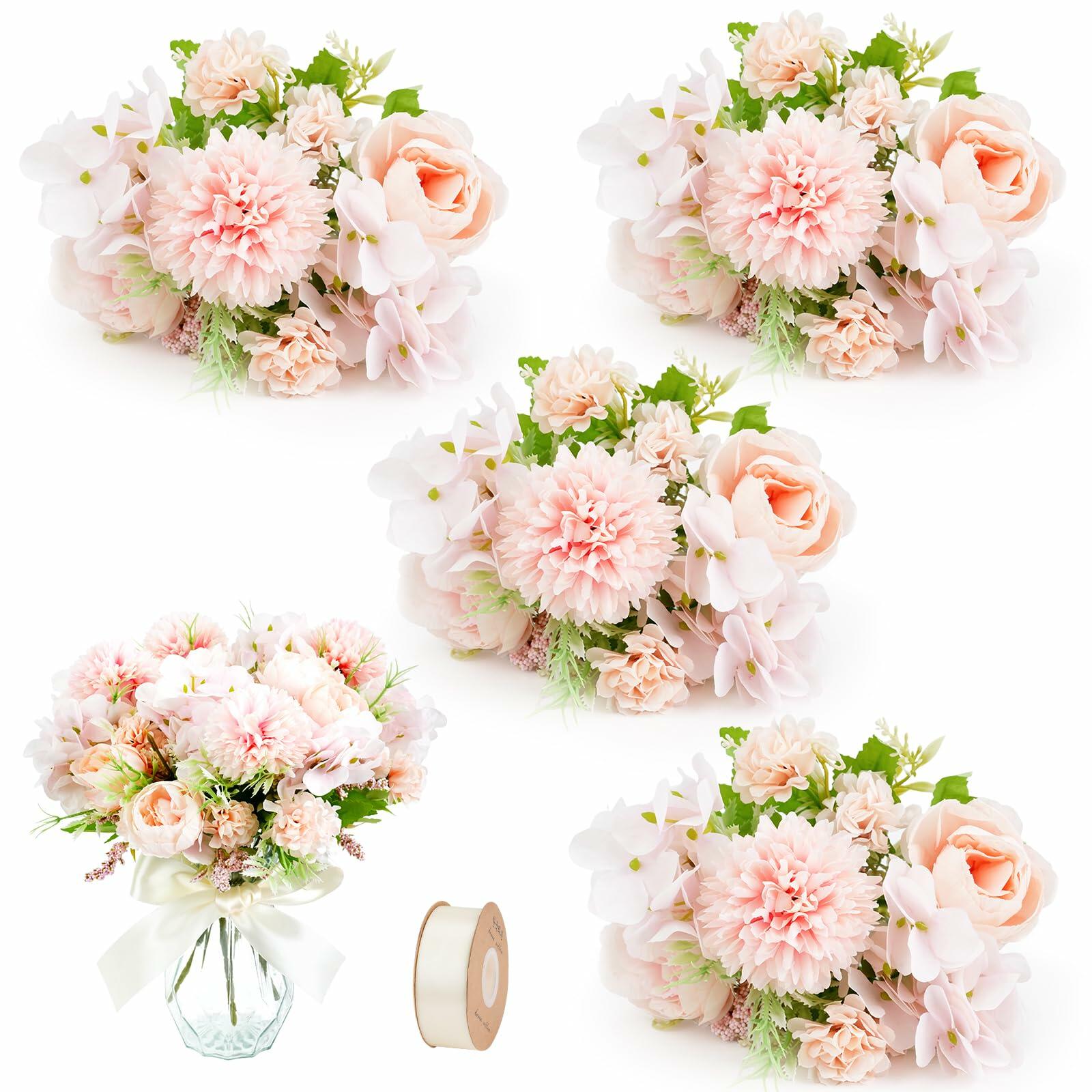 - ✿【Value Pack:】This decorative artificial flowers set contains 4 bunches of fake flowers and 1 roll of ribbon. The ribbon that comes with artificial flowers decorates it better. The fake flowers contains 7 branches of different types of flowers peonies onion bulbs large hydrangeas small hydrangeas and plastic greens in a combo pack, they are not only beautiful but also lifelike, perfect for creating romantic and warm atmosphere.