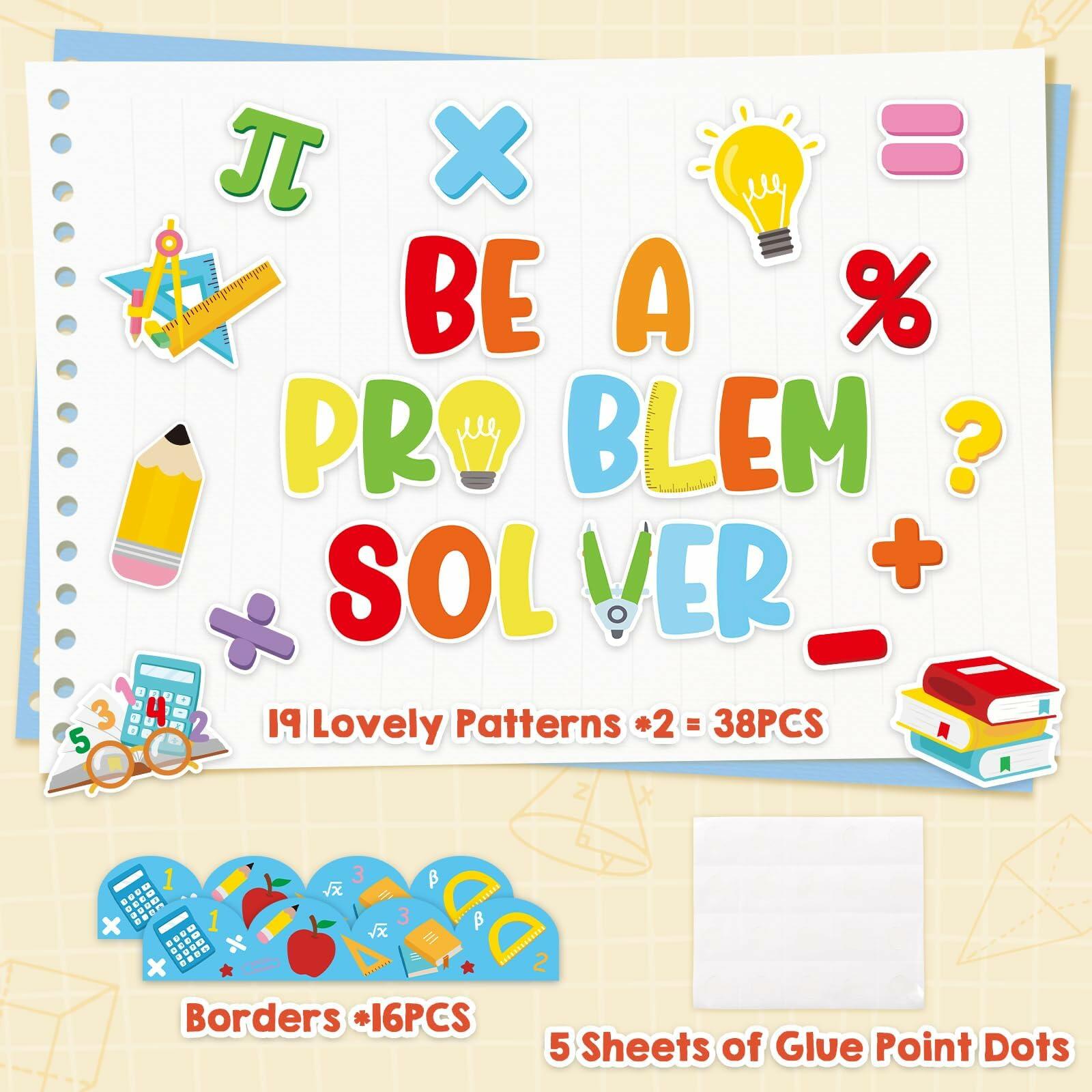 - 58PCS Back to School Bulletin Board Set: This package includes 38 pieces of pattern cutouts and 16 pieces of bulletin borders, enough to meet your decoration needs. The decor set also comes with 5 sheets of glue point dots for easy application.