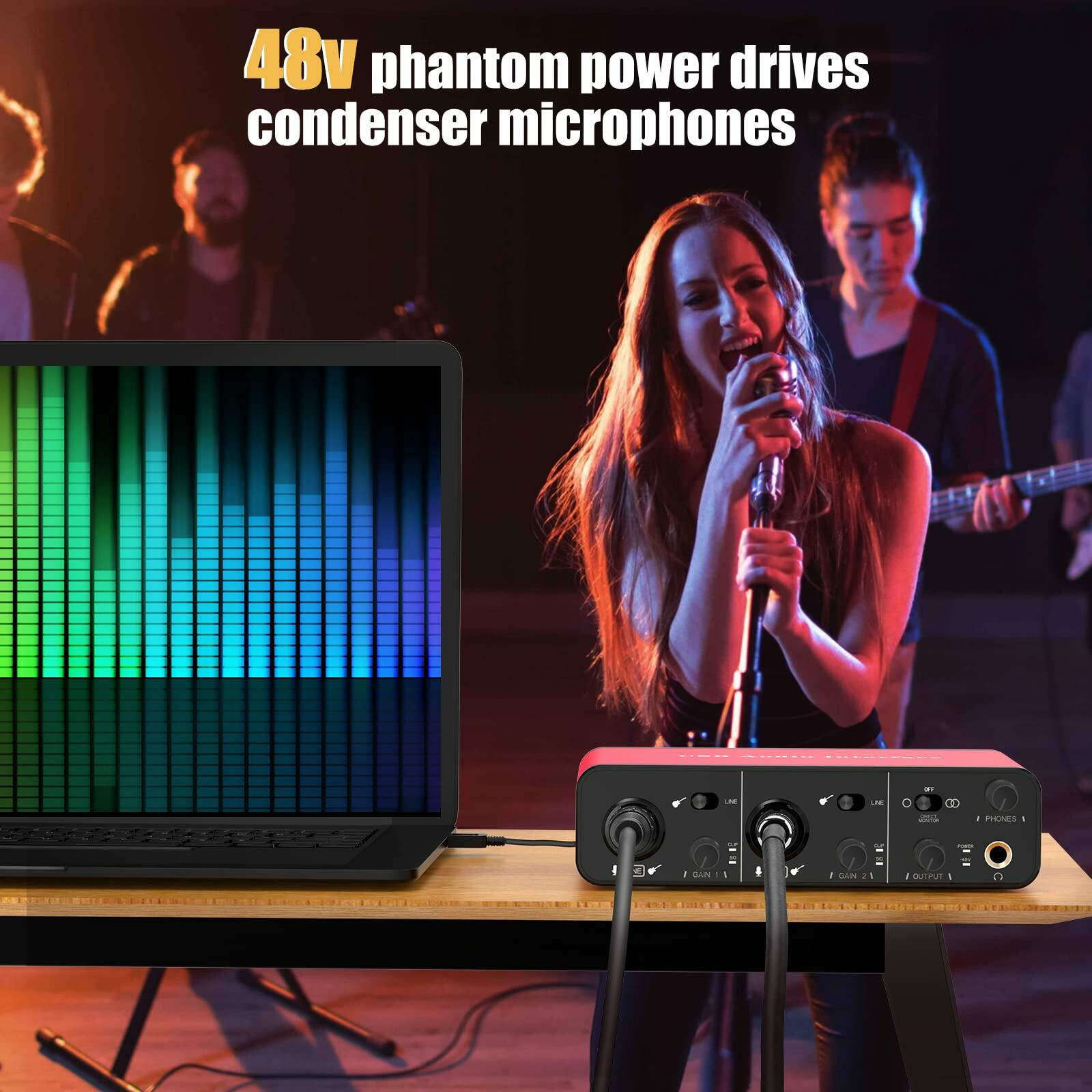 - 【+48V Phantom Power&Studio-quality headphone amp】USB audio interface has a +48 volt phantom power supply for condenser microphones input, it enables 48V phantom power at the XLR socket (required for professional studio condenser microphones).Support Headphones with Impedance of 16-300Ω. Make it possibility to output not just louder sound, but a sharper and more real stereo sound without distortion.
