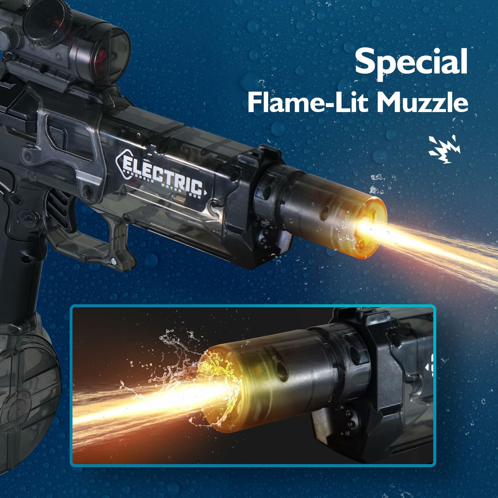 - [Cool Light-Up Electric Water Gun for Kids and Adults] Light up your summer battles! This electric water gun features a dazzling LED light effect every time you shoot. Whether at the pool, beach, or backyard, enjoy exciting water fights day or night.