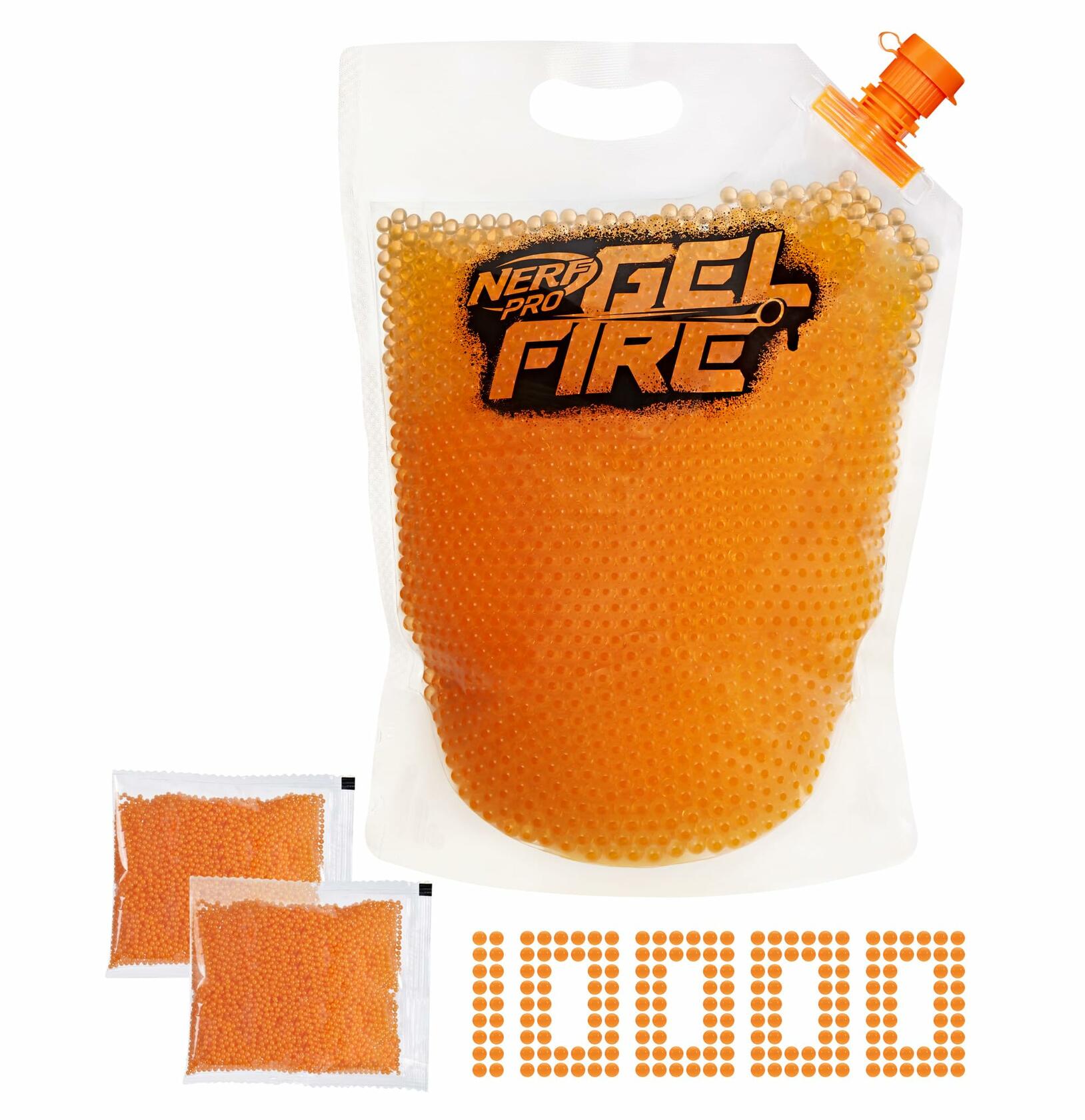 - INCLUDES 10,000 DEHYDRATED NERF PRO GELFIRE ROUNDS FOR USE WITH ALL NERF PRO GELFIRE BLASTERS: Soft super absorbent polymer projectiles fire at a high velocity and burst when they hit a target. No pick-up needed. Add water and hydrate rounds for 3 to 4 hours. Ages 14 and up. Outdoor use recommended