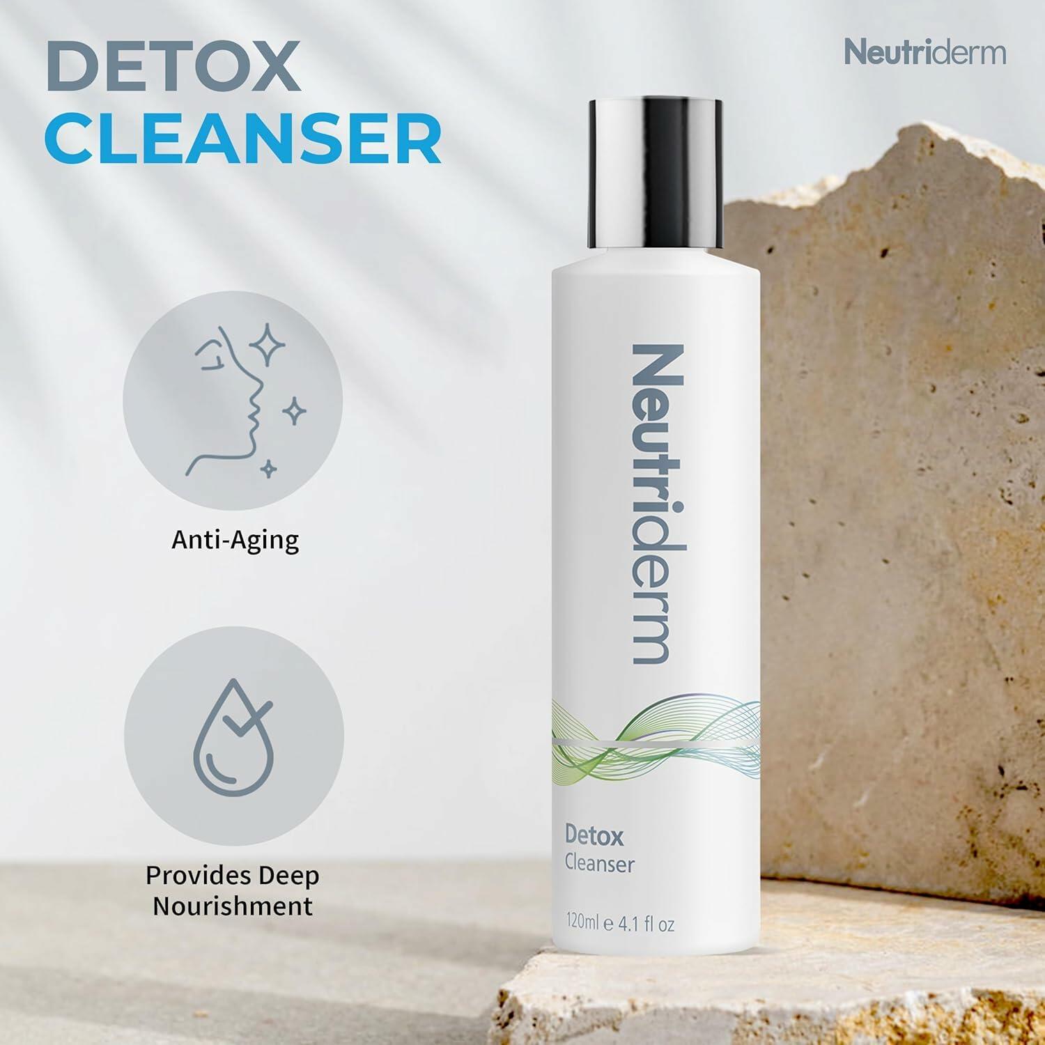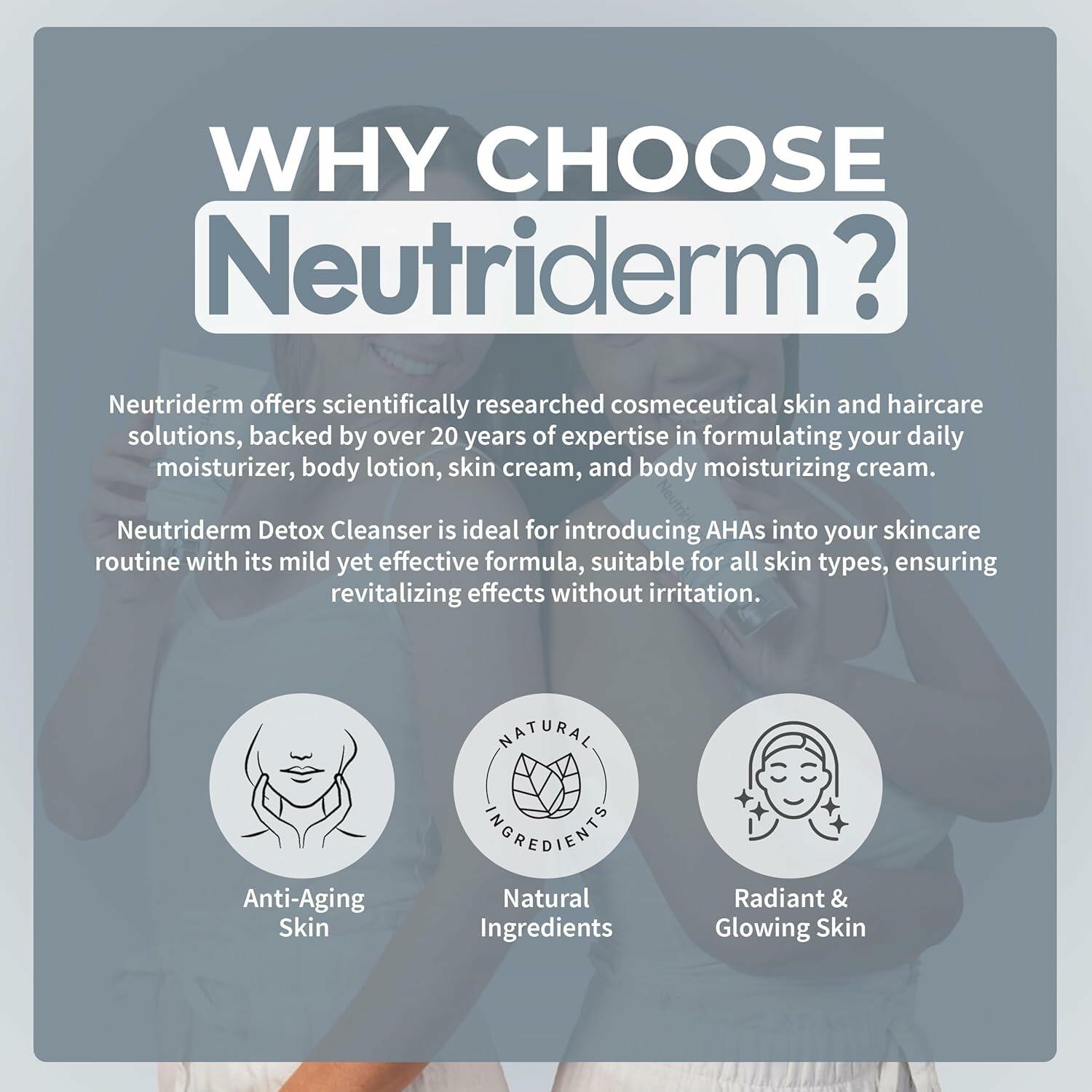 Experience the ultimate in skincare with the Neutriderm Detox Cleanser, a premier facial cleansing wash designed for a deep and refreshing clean. One of our best, this glycolic acid wash expertly removes impurities, toxins, and pollutants, making it a top choice for anyone seeking the best face cleanser to enhance their daily routine. Infused with 2% Glycolic Acid, this face cleaner provides gentle exfoliation to reveal smoother, softer skin. It's ideal for those searching for the best face wash for oily skin, offering effective yet gentle exfoliation without irritation. The Sodium PCA in the formula acts as a potent humectant, drawing moisture from the air and keeping your skin hydrated, preventing dryness and ensuring a plump, comfortable feel. Neutriderm Detox Cleanser excels in its role as a cleanser and face wash, thoroughly cleansing excess oil and debris while unclogging pores. It helps soothe blemishes and shields your skin from environmental stressors, making it a reliable option for those seeking a clean face cleanser that delivers a revitalizing clean. Whether you have normal, oily, or sensitive skin, this glycolic cleanser for face is suitable for all skin types. It integrates seamlessly into any skincare routine with a gentle yet effective formula that ensures skin stays balanced and refreshed. Directions for Use: Apply a moderate amount of Detox Cleanser to wet skin, covering the entire face and neck. Gently massage for 2 minutes, then rinse with warm water and pat dry. Use daily for optimal results. For persistent issues, consult with a skincare professional.