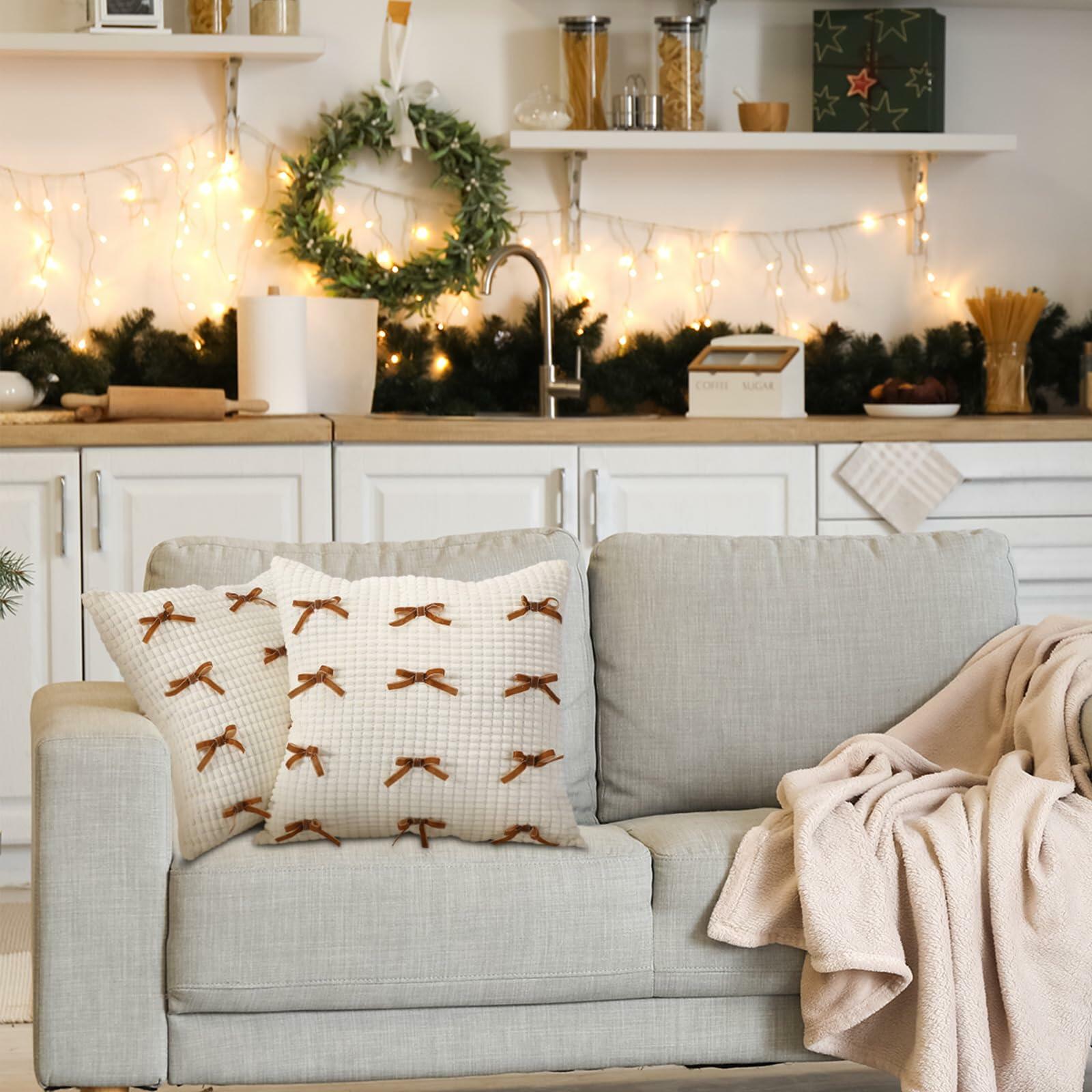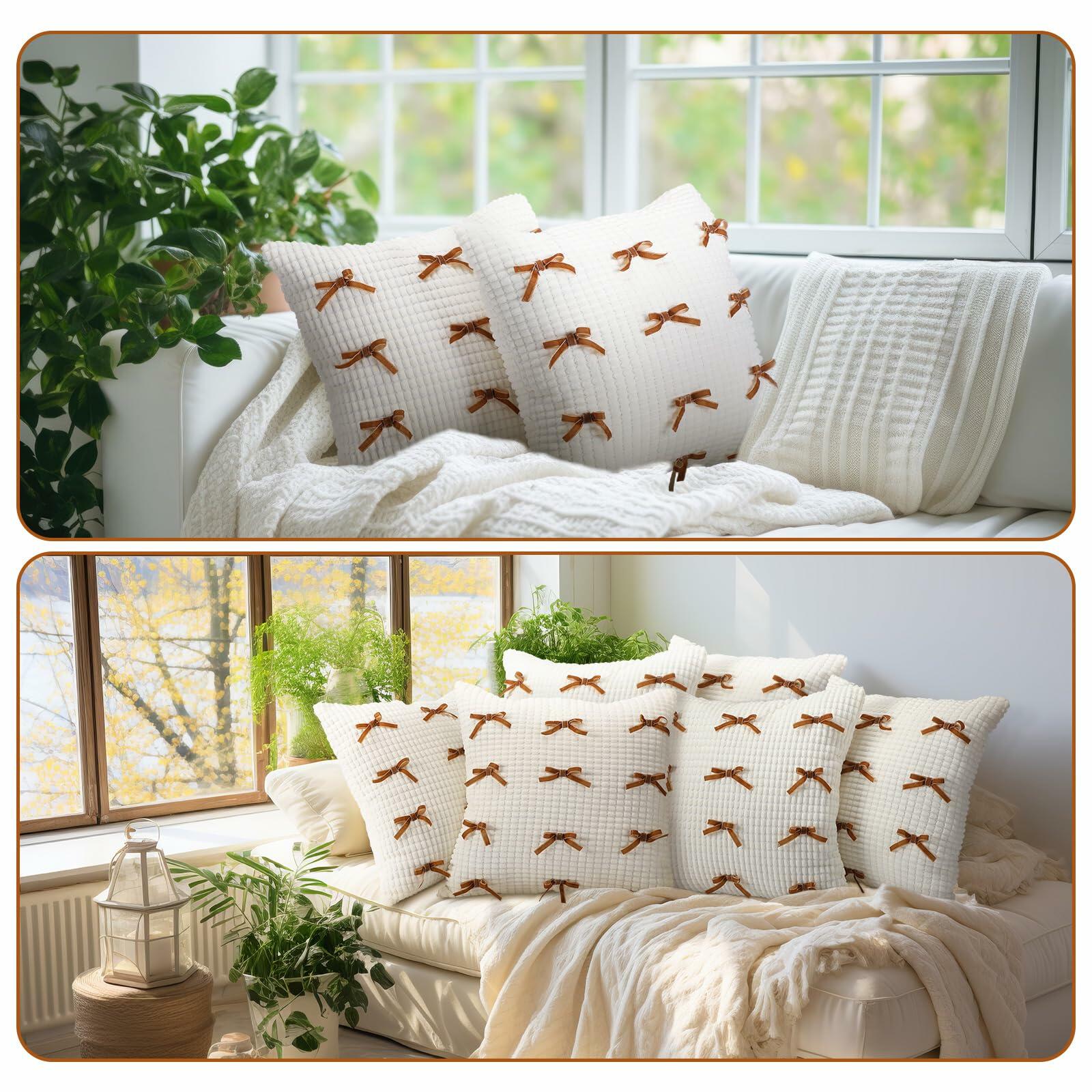 - Versatile Decor: Transform living rooms, bedrooms, offices, or outdoor spaces with our neutral yet stylish design. The white base and brown bows complement bohemian, minimalist, or classic decor styles. Use as permanent fixtures or seasonal accent, these decorative throw pillow covers adapt effortlessly to your evolving aesthetic, adding warmth and sophistication to any setting