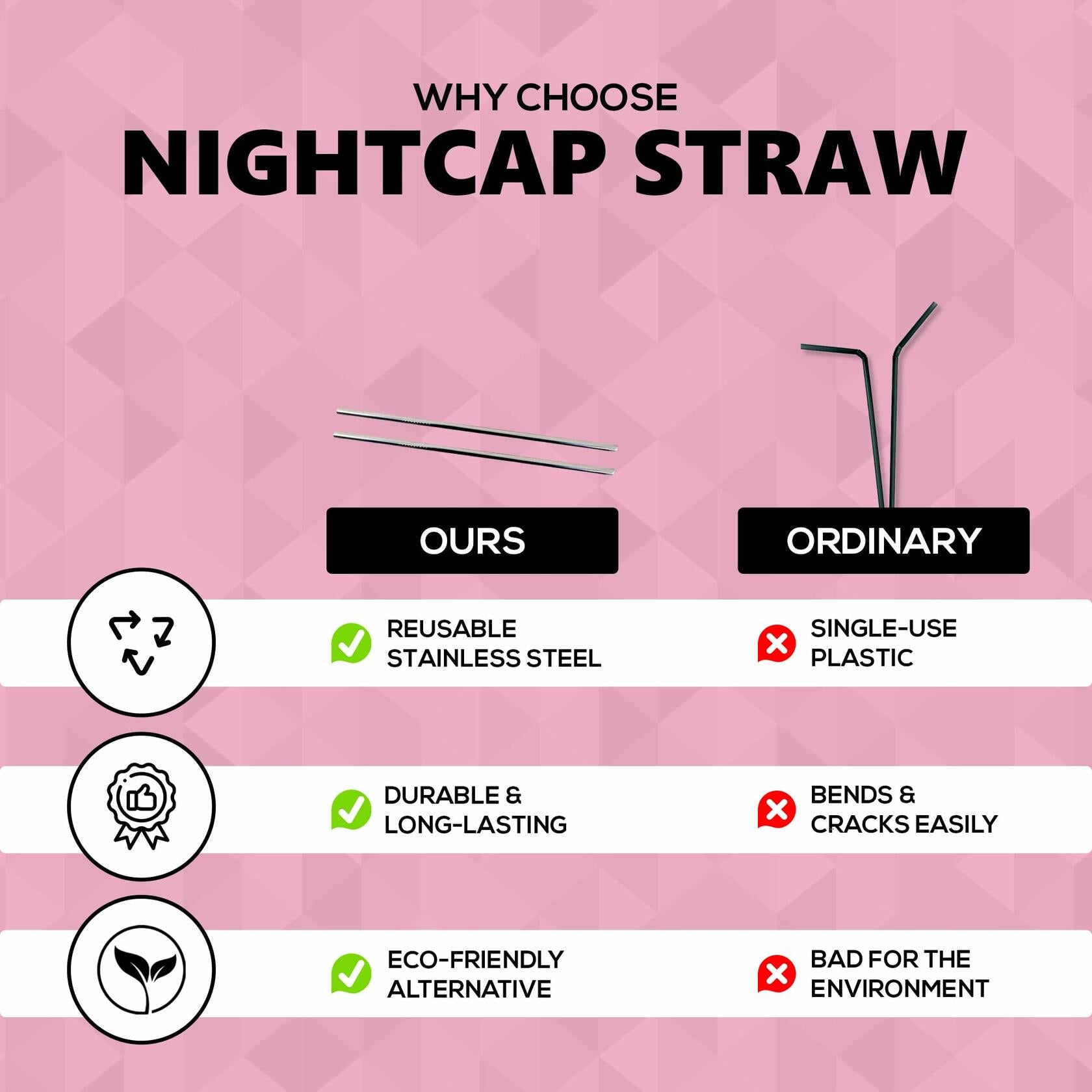- Comfortable Sipping - the stainless steel straws with silicone tips provide a soft covering to protect your lips and teeth. Pair these reusable drinking straws with your NightCap Drink Scrunchie and enjoy your favorite beverage