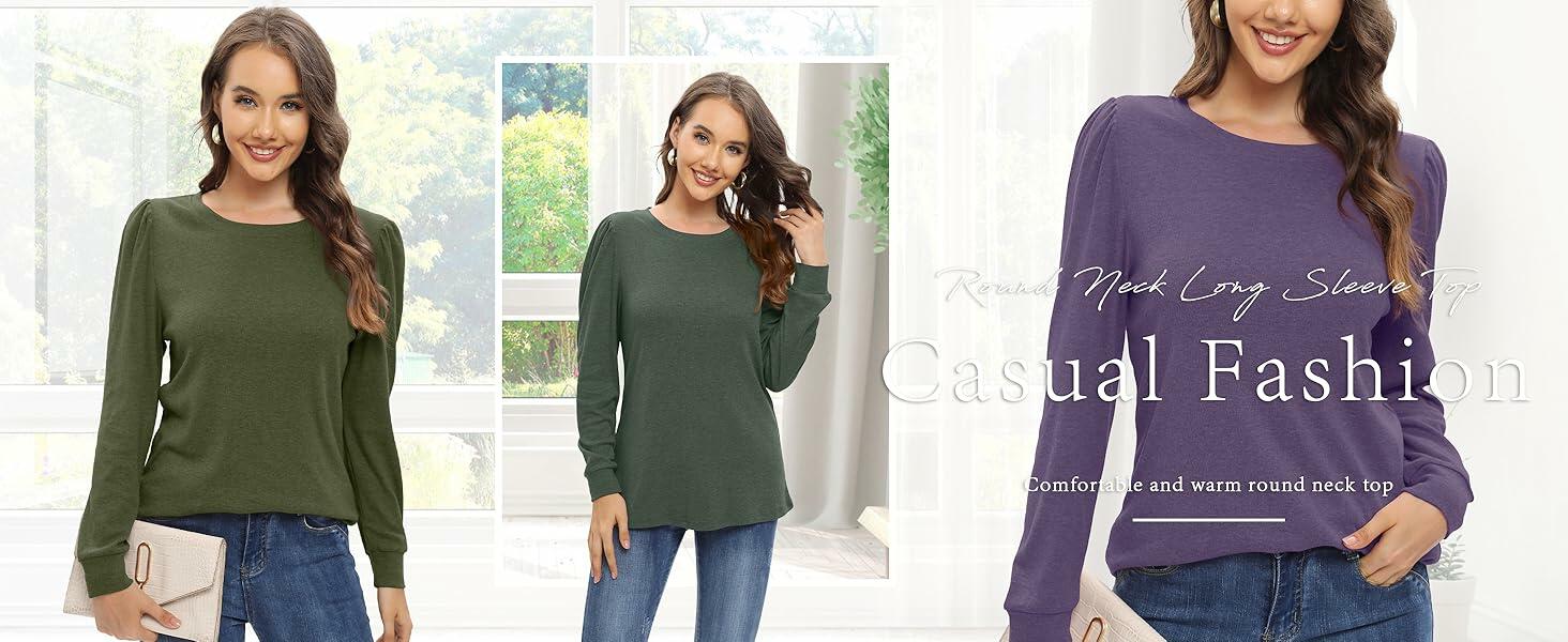 - Features: Long Sleeve, Crewneck, Relaxed Fit. Casual round neck tops is made with lightweight and soft material that makes you feeling well for the soft skin, and it looks great with Jeans, pants, leggings, sneakers, boots, flats, and also perfect wear alone or dress up with a nice necklace or scarf