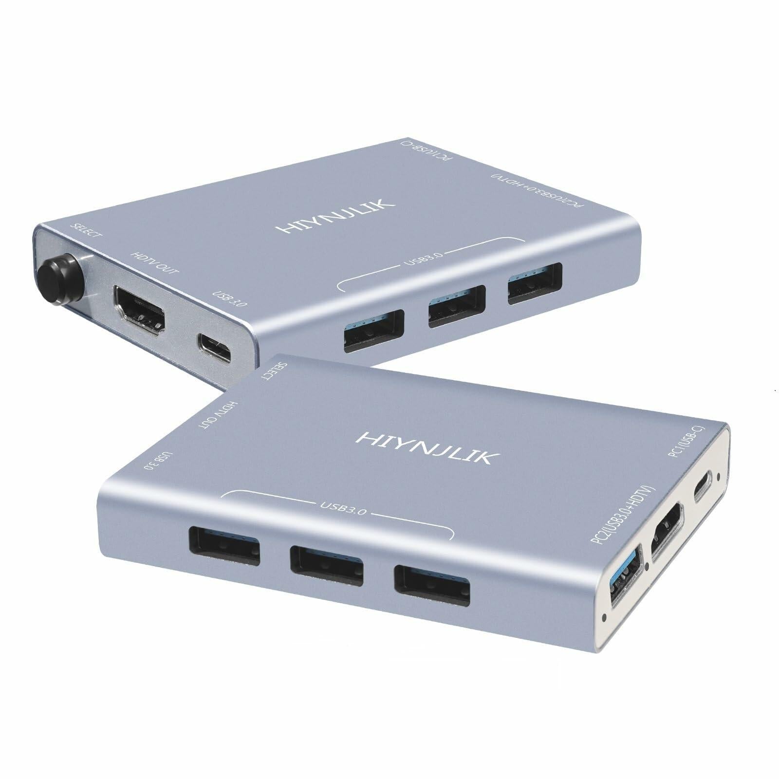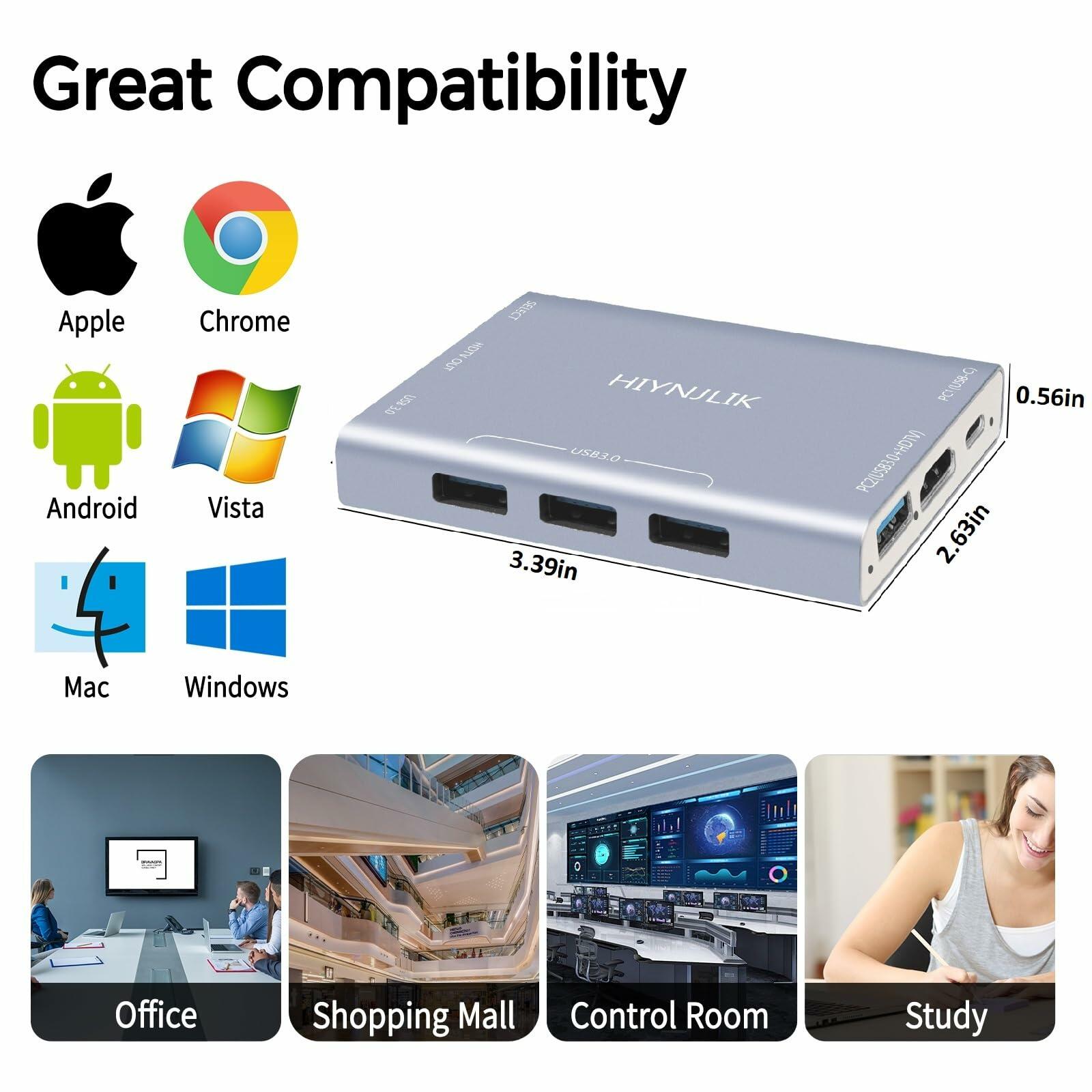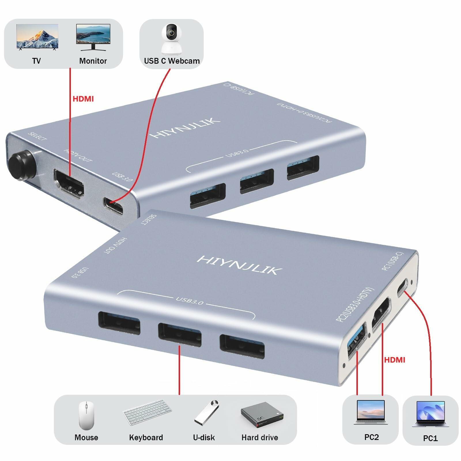 - 【KVM Switcher】Great KVM Switch.USB-C and USB3.0 HDMI KVM Switch can simultaneously switch HDMI, USB functions.3-In 5-Out USB-C switcher supports sharing 1monitor and 4 USB devices like a keyboard, mouse, and USB-Microphone between 2 computers. Switch freely between work computer and personal laptop to boost work efficiency.NOTE:3 in ports=USB-C ports(for PC1) + 1 USB-A 3.0 port(for PC2)+ 1 HDMI2.0 port(for PC2),5 out ports=3 USB-A 3.0 ports + 1 USB-C 3.0 port + 1 HDMI 2.0 port.