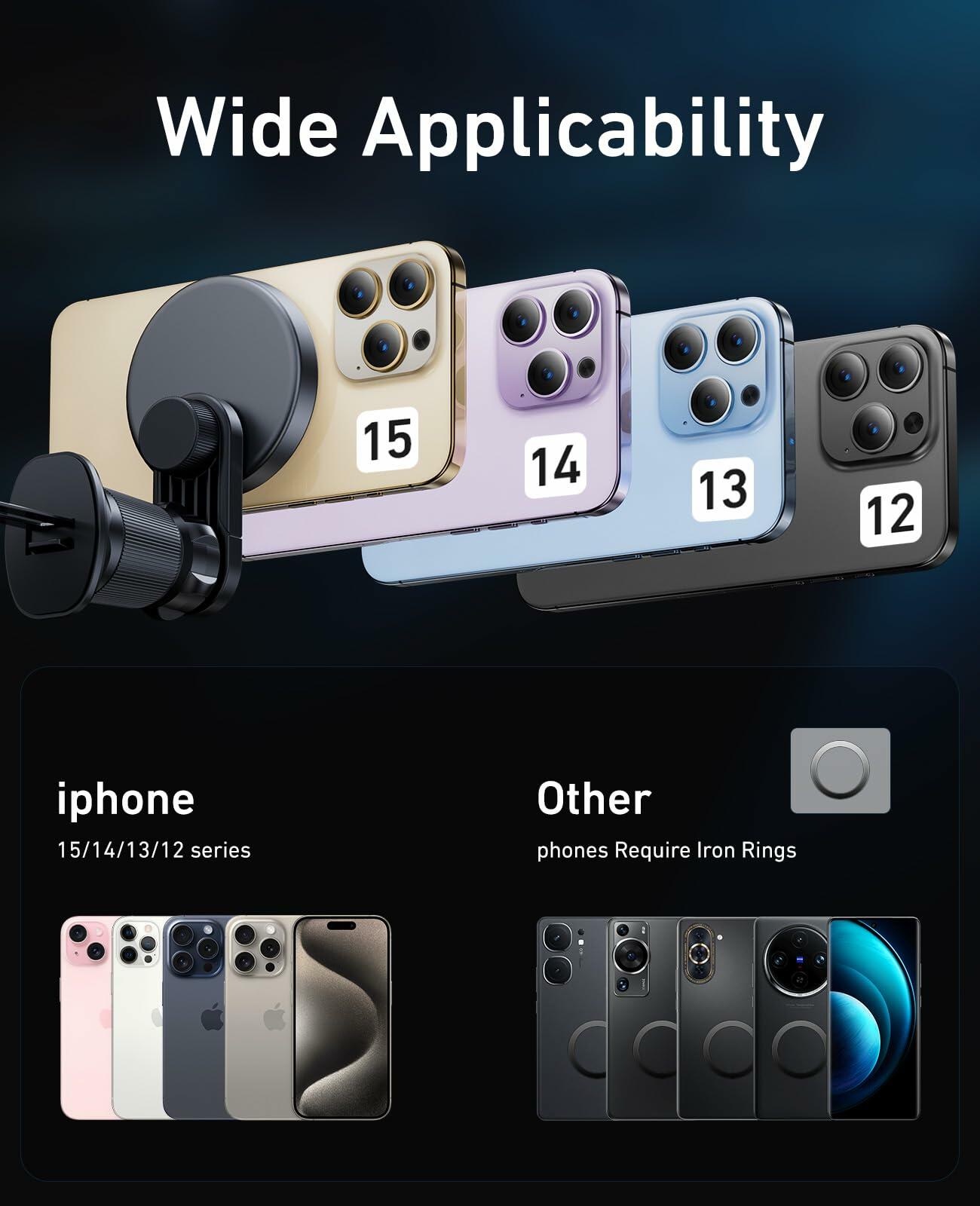 - 【WIDE COMPATIBILITY】NIYEVN car mount magnet can place directly to iPhone 15/14/13/12 Pro Max Plus Mini & MagSafe cases. If you own a non-MagSafe phone, NIYEVN magnetic phone holder for car attached 2 additional metal rings to go with it.
