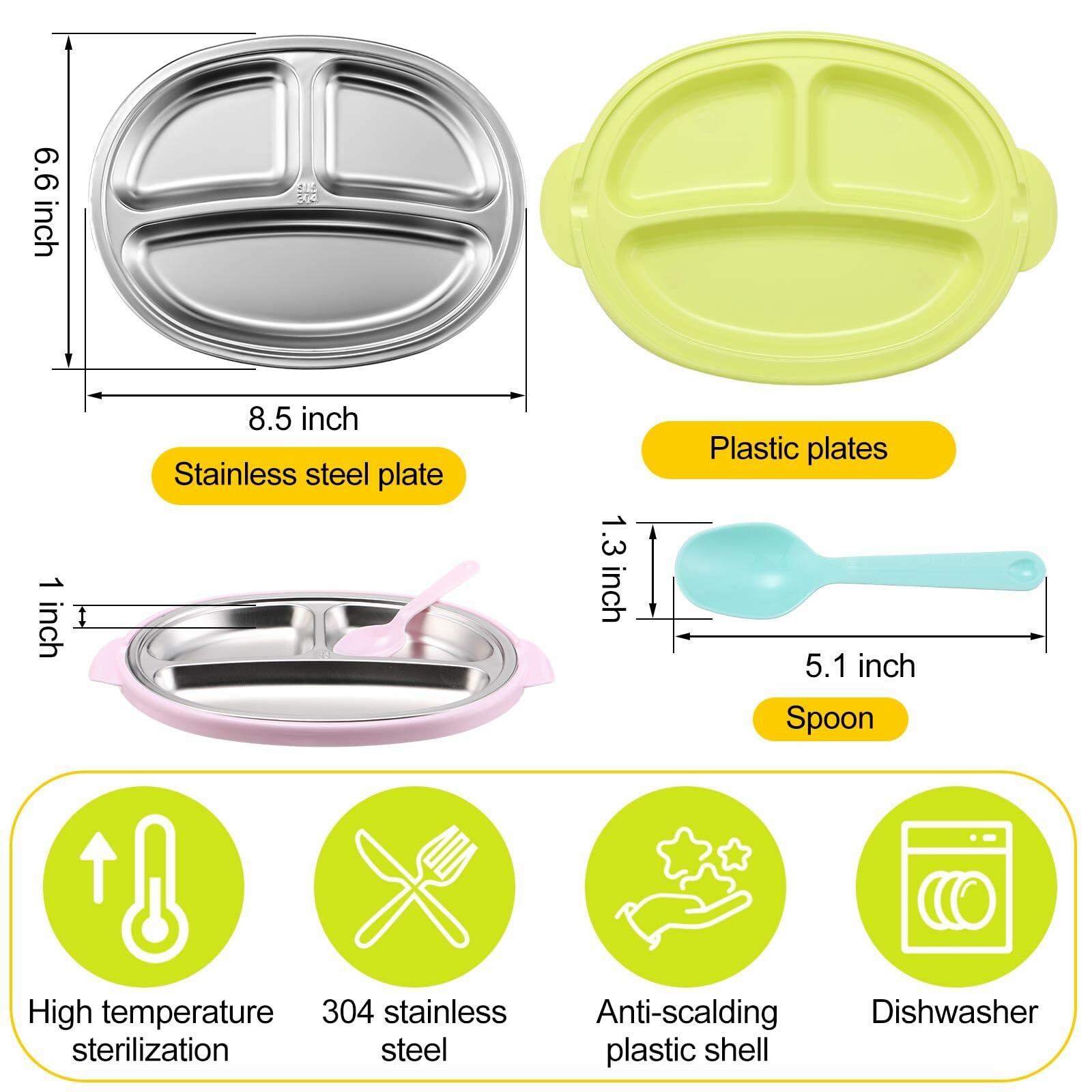 Features: Our stainless steel plate 2 In 1 desisn makes it safer for young children to use, avoiding the risk of burns and allowing new parents to enjoy every meal with peace of mindThe stackable dinner plates with dividers are great for home or outdoor use such as picnics, camping, BBQ, holiday, birthday party, school and moreSpecifications: Material: 304 stainless steelColor: green, pink, blueSize: 8.5"W x 6.6"H x 1"DPackage includes: 3 Stainless steel kids platesNotes: Manual measurement, please allow slight errors on size. The color may exist a slight difference due to different screen displays.
