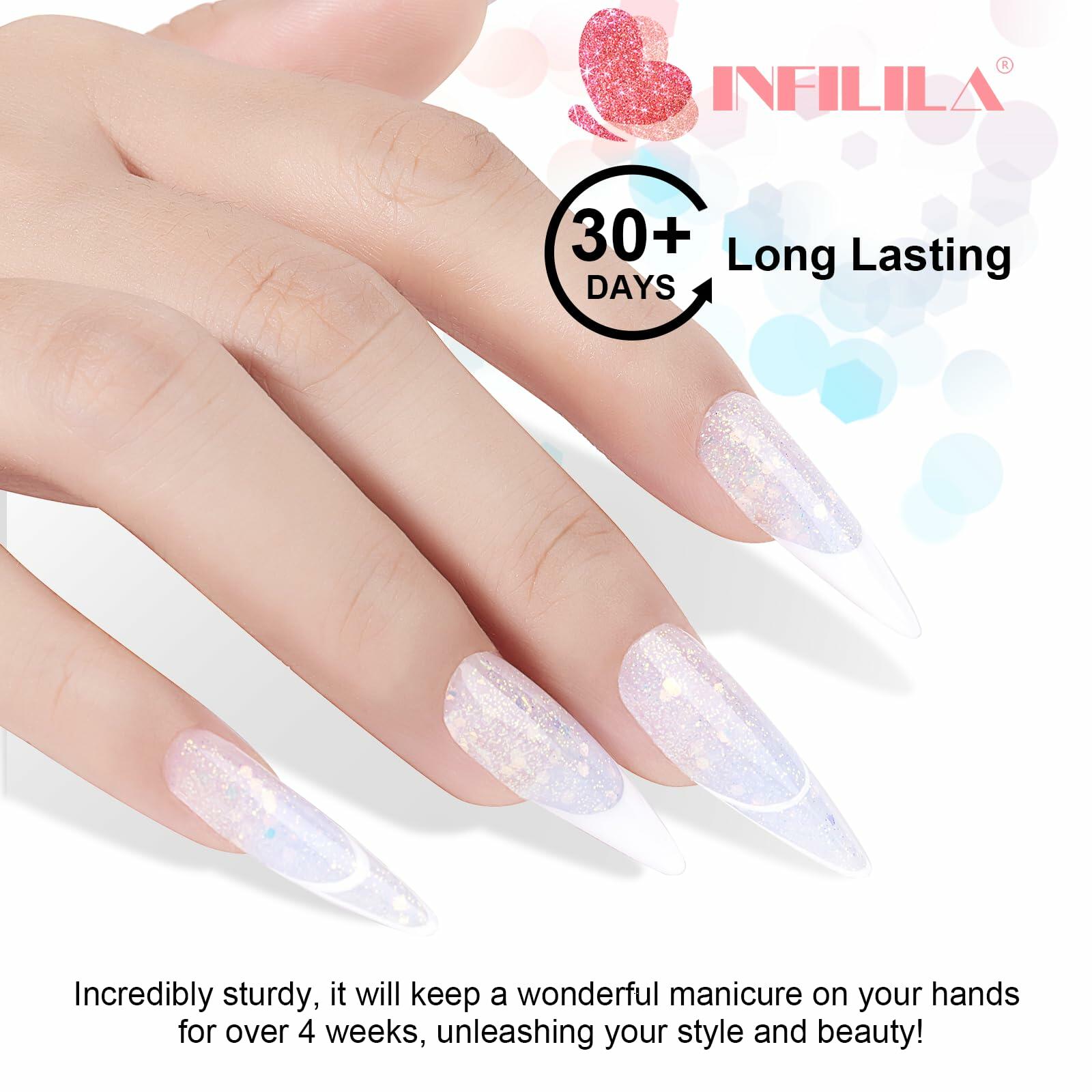 INFILILA POLY NAIL GEL: With a large capacity of 50ml, it can be used for a long time and is very affordable.Mixed with sparkling sequins inside, applying it to your nails makes you look more unique and lively. It gives off a different glow under the light, which is perfect for both lightly applying gel and doing all kinds of styling, and you can use it all year round and on all occasions. This nail extension gel can make your nails look fuller, you can easily create a variety of nail extension effects, and different colors to show different styles.HOW TO USE: Step 1: Polish nail surface before use. Step 2:Apply base gel. Step 3: Apply the appropriate amount of extension gel evenly on the nail form. Step 4:Press the nail form onto the nail while curing with a UV lamp for 90-120 seconds. Step 5:Take off the nail form. Step 6:Polish the nail form to your favorite shape. Step 7: Apply top coat.