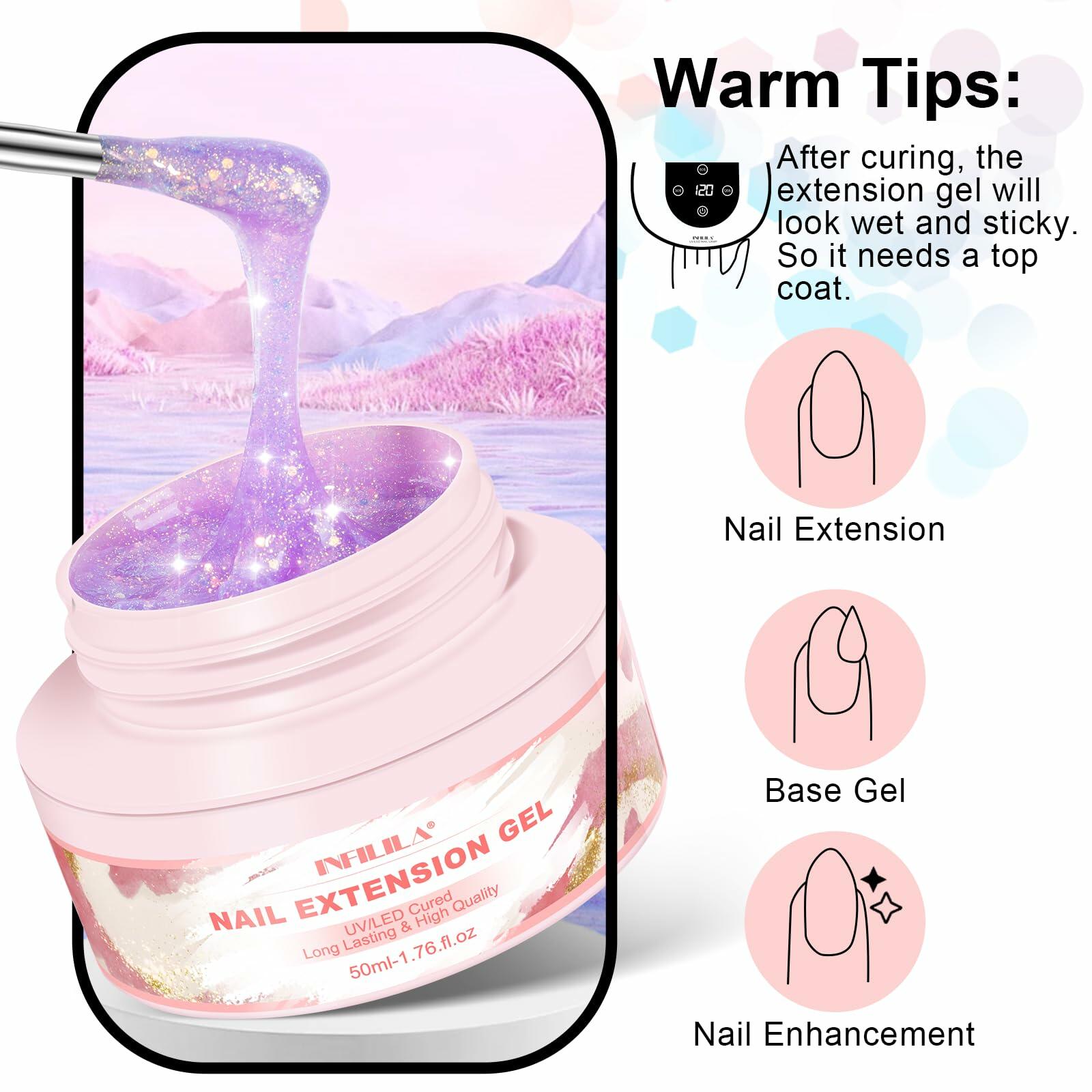 NXJ INFILILA Poly Nail Gel: With a large capacity of 50ml, it can be used for a long time and is very affordable.Mixed with sparkling sequins inside, applying it to your nails makes you look more unique and lively. It gives off a different glow under the light, which is perfect for both lightly applying gel and doing all kinds of styling, and you can use it all year round and on all occasions. This nail extension gel can make your nails look fuller, you can easily create a variety of nail extension effects, and different colors to show different styles.HOW TO USE: Step 1: Polish nail surface before use. Step 2:Apply base gel. Step 3: Apply the appropriate amount of extension gel evenly on the nail form. Step 4:Press the nail form onto the nail while curing with a UV lamp for 90-120 seconds. Step 5:Take off the nail form. Step 6:Polish the nail form to your favorite shape. Step 7: Apply top coat.