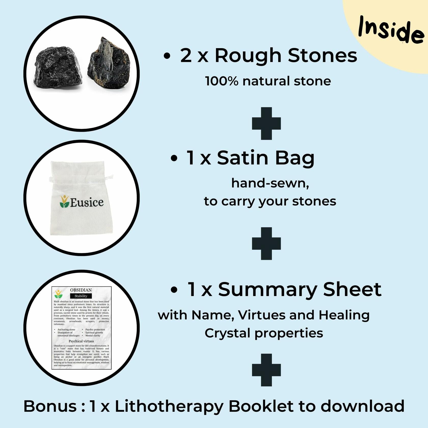 - ⏺ WHAT YOU WILL RECEIVE: 2 x Raw Obsidians, 1 x Virtue Summary Sheet, 1 x Healing Crystals Guide (Care, Cleaning, Recharging and Purification Tips), 1 x Satin Pouch (hand-sewn) and... We love our stones, we pamper them so we can make sure you only receive exceptional stones. So if you don't like one of them, contact us and we'll bend over backwards to rectify the situation within 24 hours!