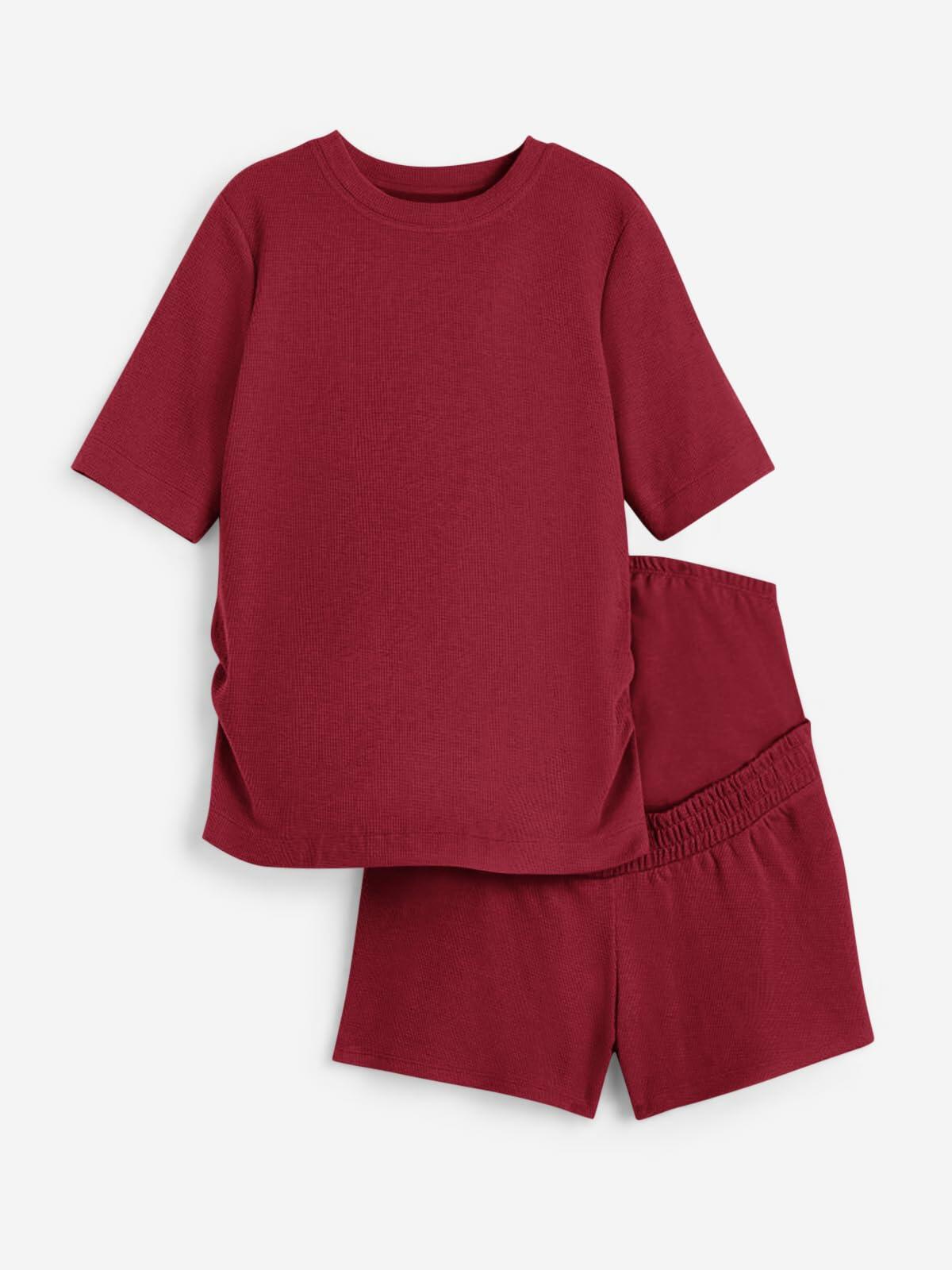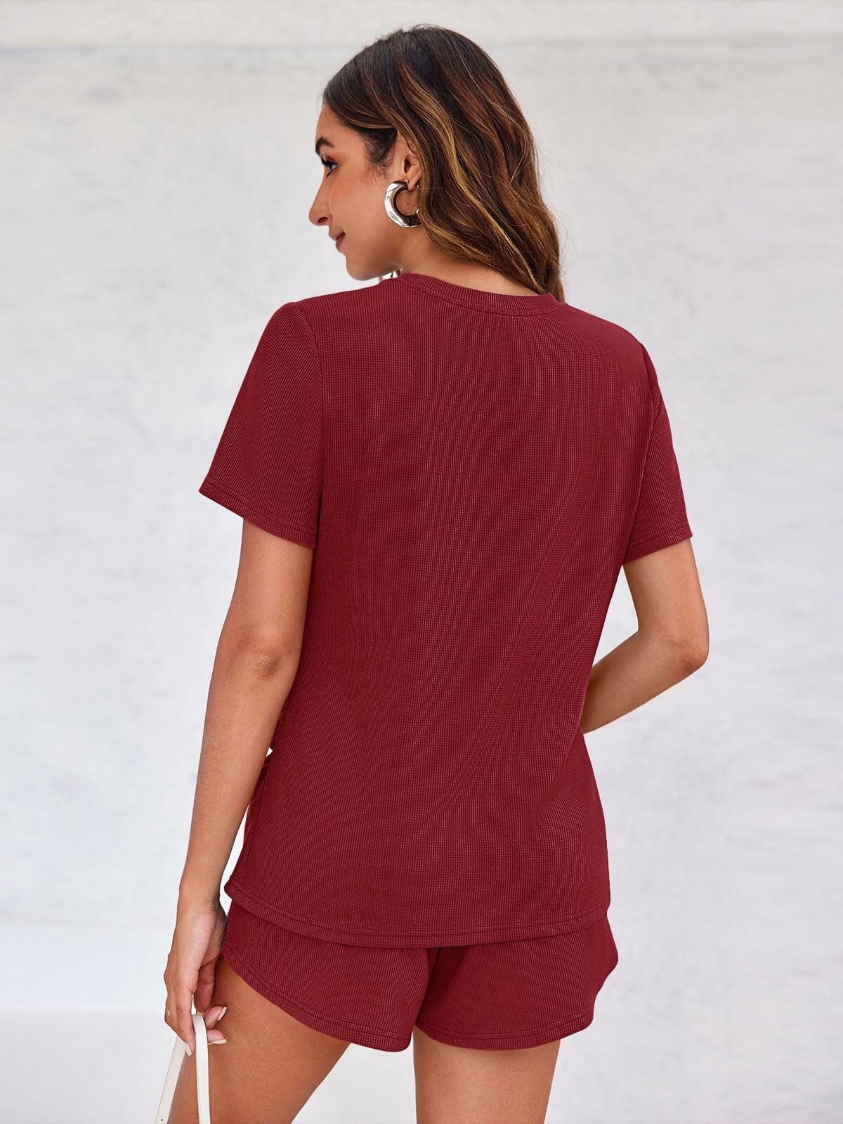 - 【DESIGN】Comfortable loungewear set with a T-shirt and pair of shorts in waffled jersey. womens shirt with a loose-fit, round neck and short sleeve design. Shorts with elastic waistband and over the belly for best fit of the tummy. Classic and convenient designs make this pjs sets more stylish and unique