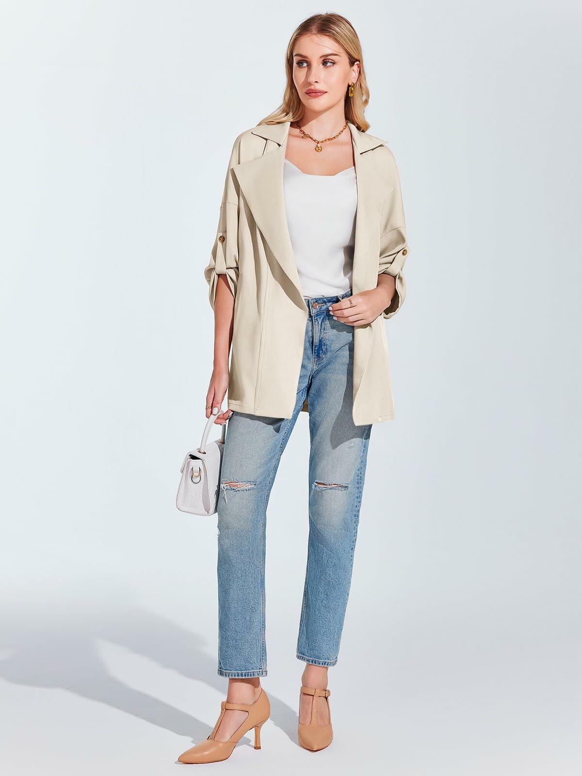 - Features: Womens casual jackets could roll up with buttons as 3/4 sleeve or wear as normal long sleeve tops, oversized and lightweight style, solid color, open front, two utility side pockets, lapel neck jackets for women, flowy loose fit to suit for every bodyshape