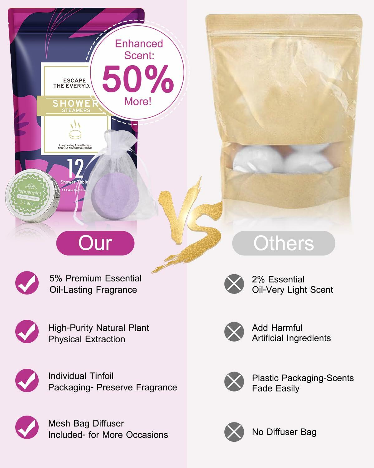 - Discover Your Soothing Escape - The Shower Tablets dissolve slowly and release the fragrance to fill your bathroom with peaceful scents that leave you feeling rejuvenated. Soothe your senses and create a momentary escape from the stresses of everyday life with our collection of 12 exquisite shower steamers