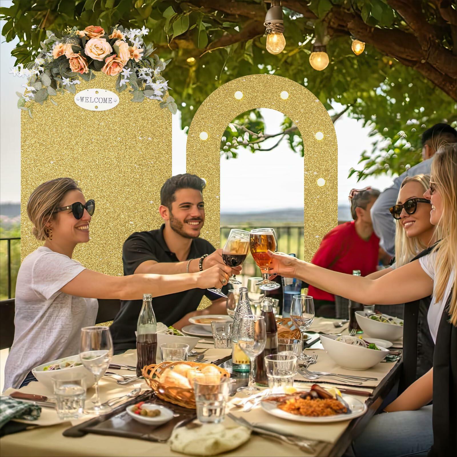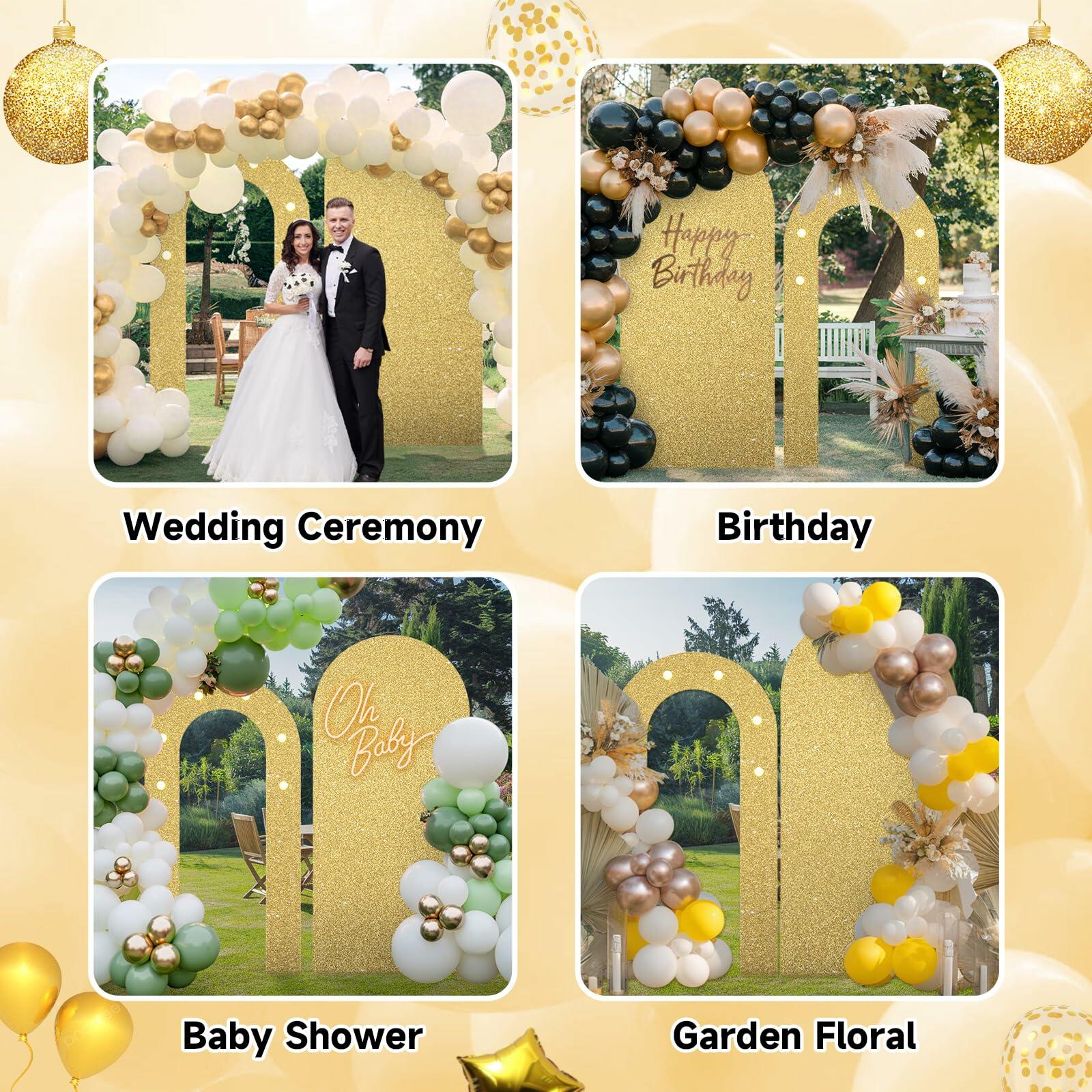 - 【Elegant Exclusive Outdoor Styling】Standing at an impressive height of over 5 feet with stable outdoor support tools, these arch stand redefine luxury and style. Perfect for setting a dreamy ambiance at birthday, bridal showers, festival, baby showers, or anniversary events. Featuring a high-gloss glitter gold surface with light bulbs, this outdoor arch backdrop radiates charm in any setting, be it daytime or under glowing lights, delivering a magical touch to your special occasions.