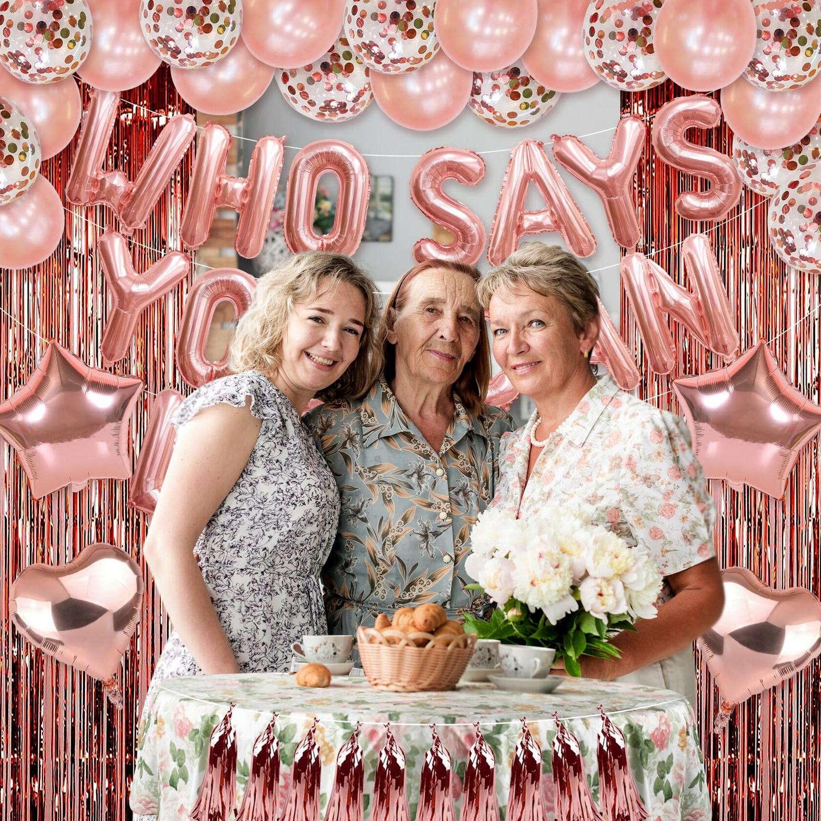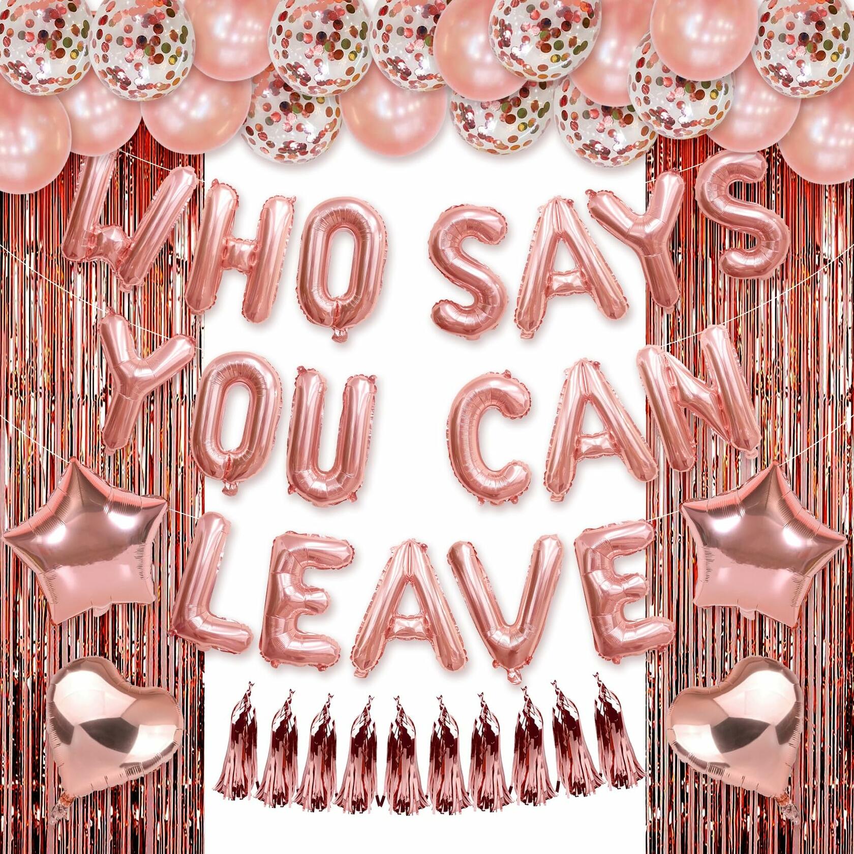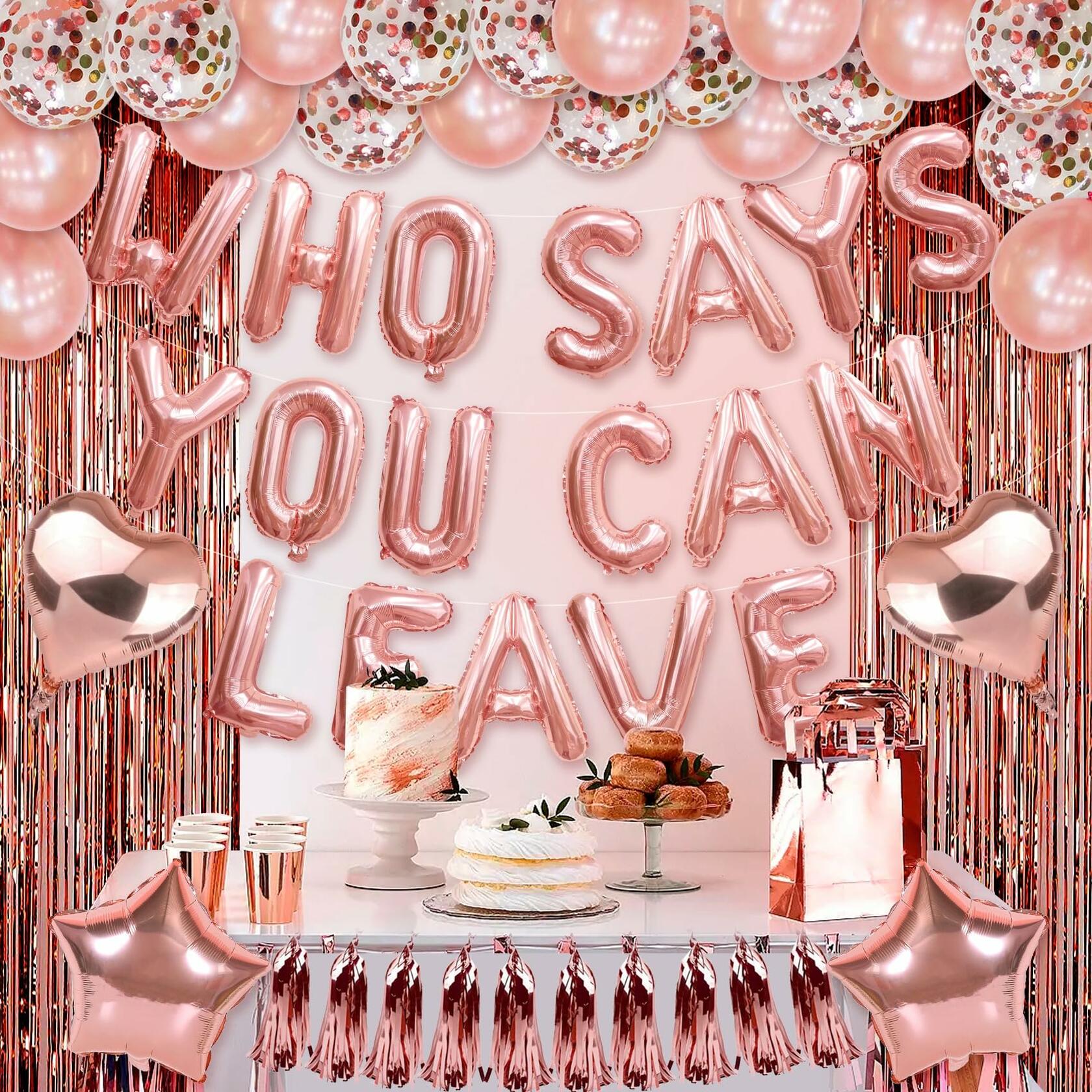 - What Can You Get: Our farewell decorations party set includes everything you need to create a stunning and unforgettable party. You will get 1pc “WHO SAYS YOU CAN LEAVE" letters foil balloons set, 2pcs 18" star foil balloons, 2pcs 18" love foil balloons, 10pcs 12" rose gold latex balloons, 10pcs 12" confetti latex balloons, 10pcs 14" paper tassel, and 2pc 3.2ft x 6.5ft rose gold foil fringe curtains.