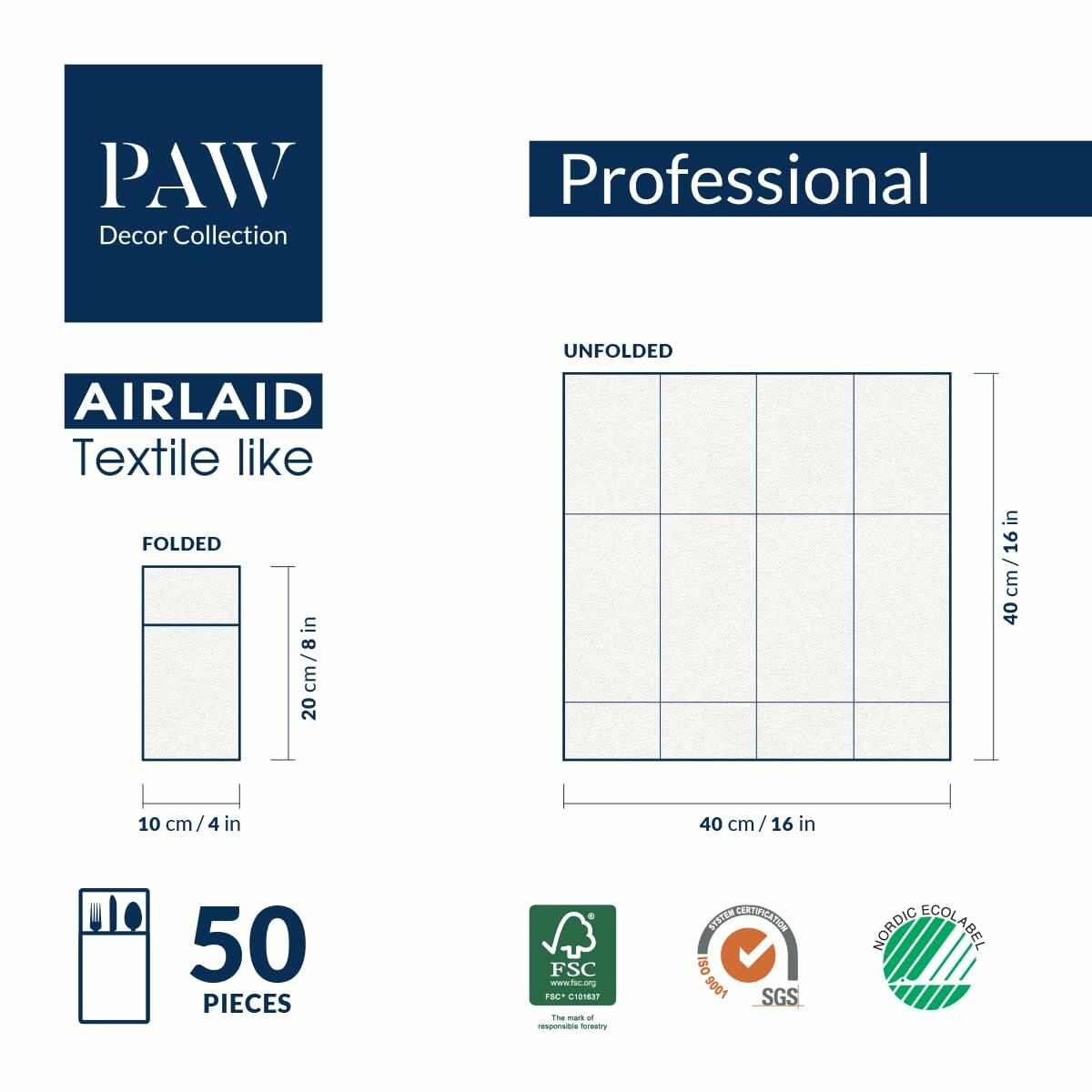Introducing our Premium Airlaid napkins, carefully designed to enhance the elegance and practicality of any meal. Made from high quality Airlaid paper, these napkins have a weight of 55 gsm, providing a sturdy but soft texture that feels like fabric. They are extremely absorbent and suitable for outdoor events. FSC certified and made in Europe, they reflect our commitment to sustainability and quality. Each napkin measures 16 x 16 inches and can be folded into a different shapes as the napkins hold well the shape. The pack contains 50 pieces. Airlaid material is much stronger, more porous and softer than regular tissue paper. Its excellent absorbency means that the napkins can easily handle spills, and the fabric-like structure provides a soft touch that will not scratch surfaces. Whether you're hosting a grand celebration or an everyday meal, our Premium Airlaid napkins will add sophistication to your table, turning any event into an unforgettable experience for your guests.